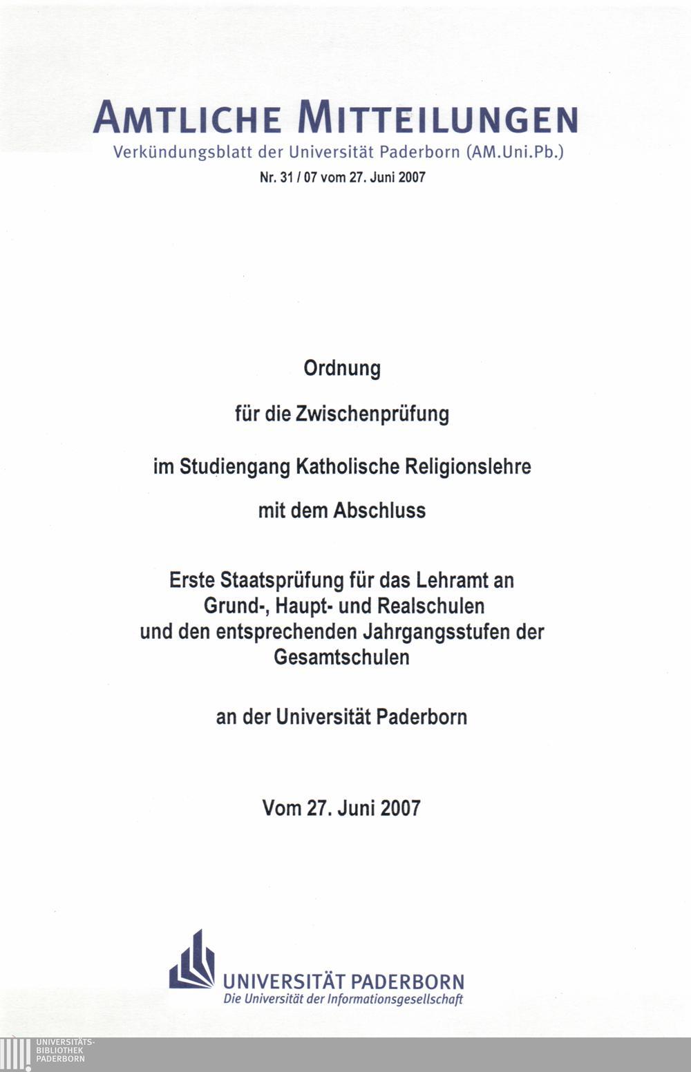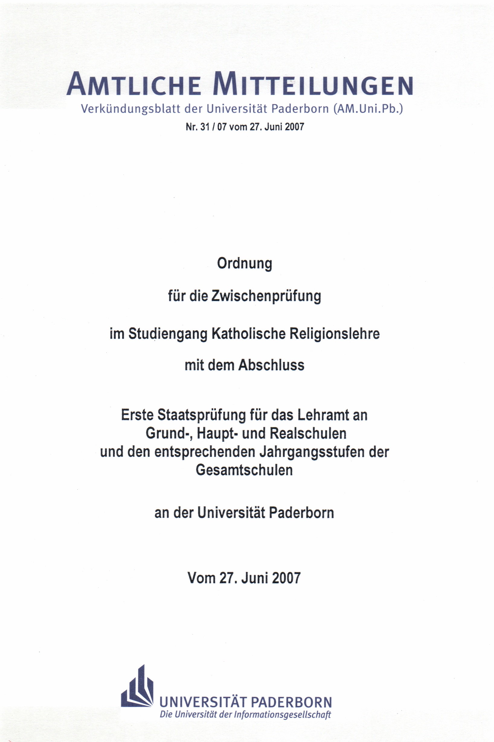 Ordnung für die Zwischenprüfung im Studiengang Katholische Religionslehre mit dem Abschluss Erste Staatsprüfung für das Lehramt an Grund-, Haupt- und Realschulen und den entsprechenden Jahrgangsstufen der Gesamtschulen an der Universität Paderborn : vom 27. Juni 2007