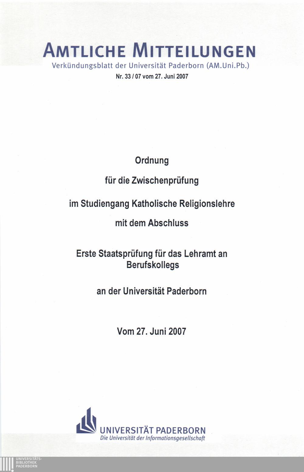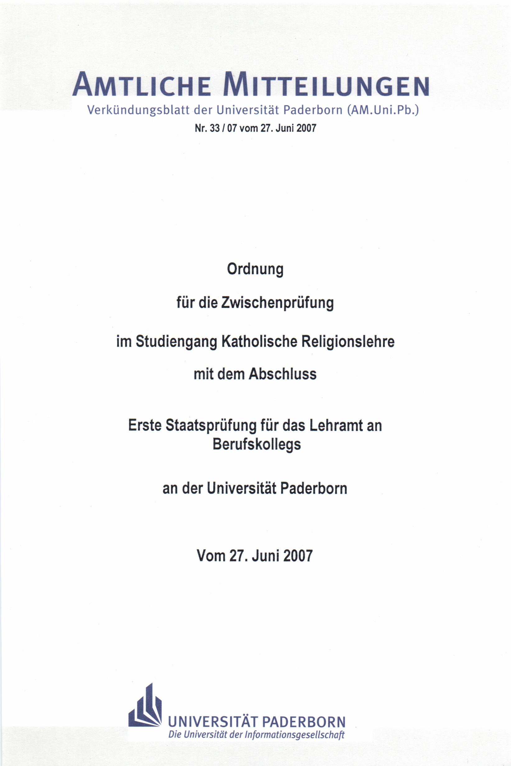 Ordnung für die Zwischenprüfung im Studiengang Katholische Religionslehre mit dem Abschluss Erste Staatsprüfung für das Lehramt an Berufskollegs an der Universität Paderborn : vom 27. Juni 2007