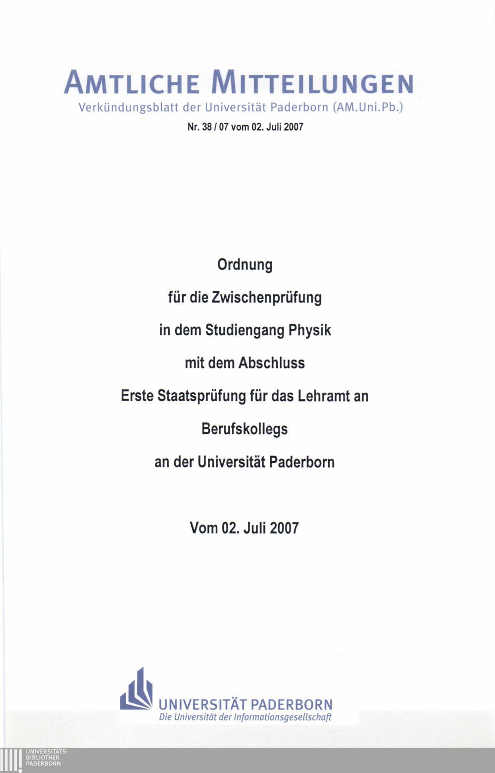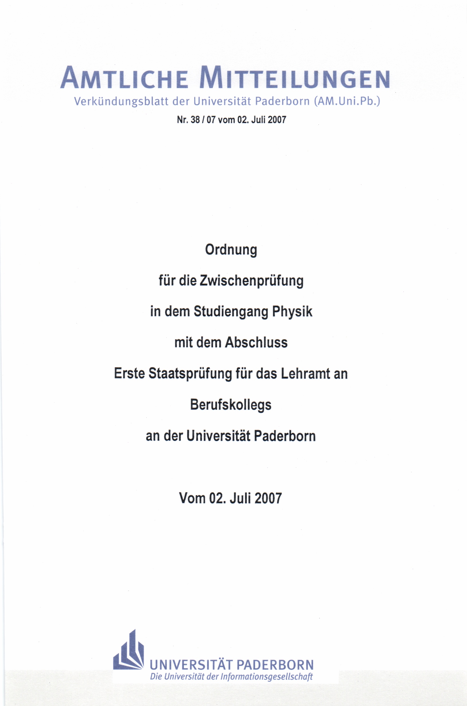 Ordnung für die Zwischenprüfung in dem Studiengang Physik mit dem Abschluss Erste Staatsprüfung für das Lehramt an Berufskollegs an der Universität Paderborn : vom 02. Juli 2007