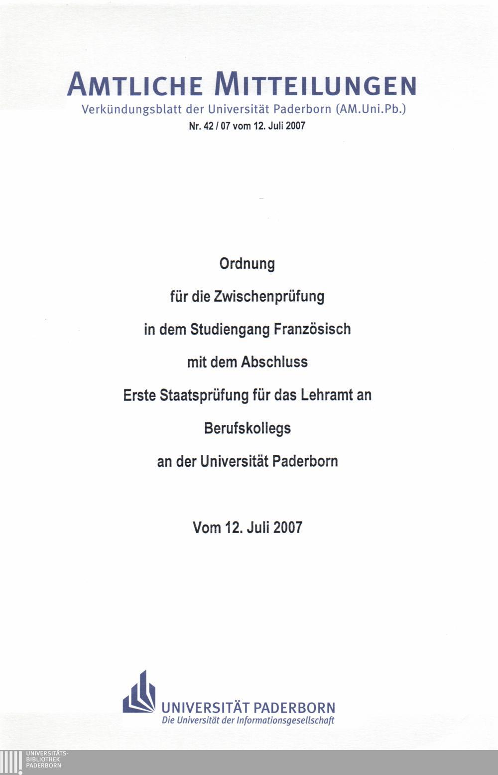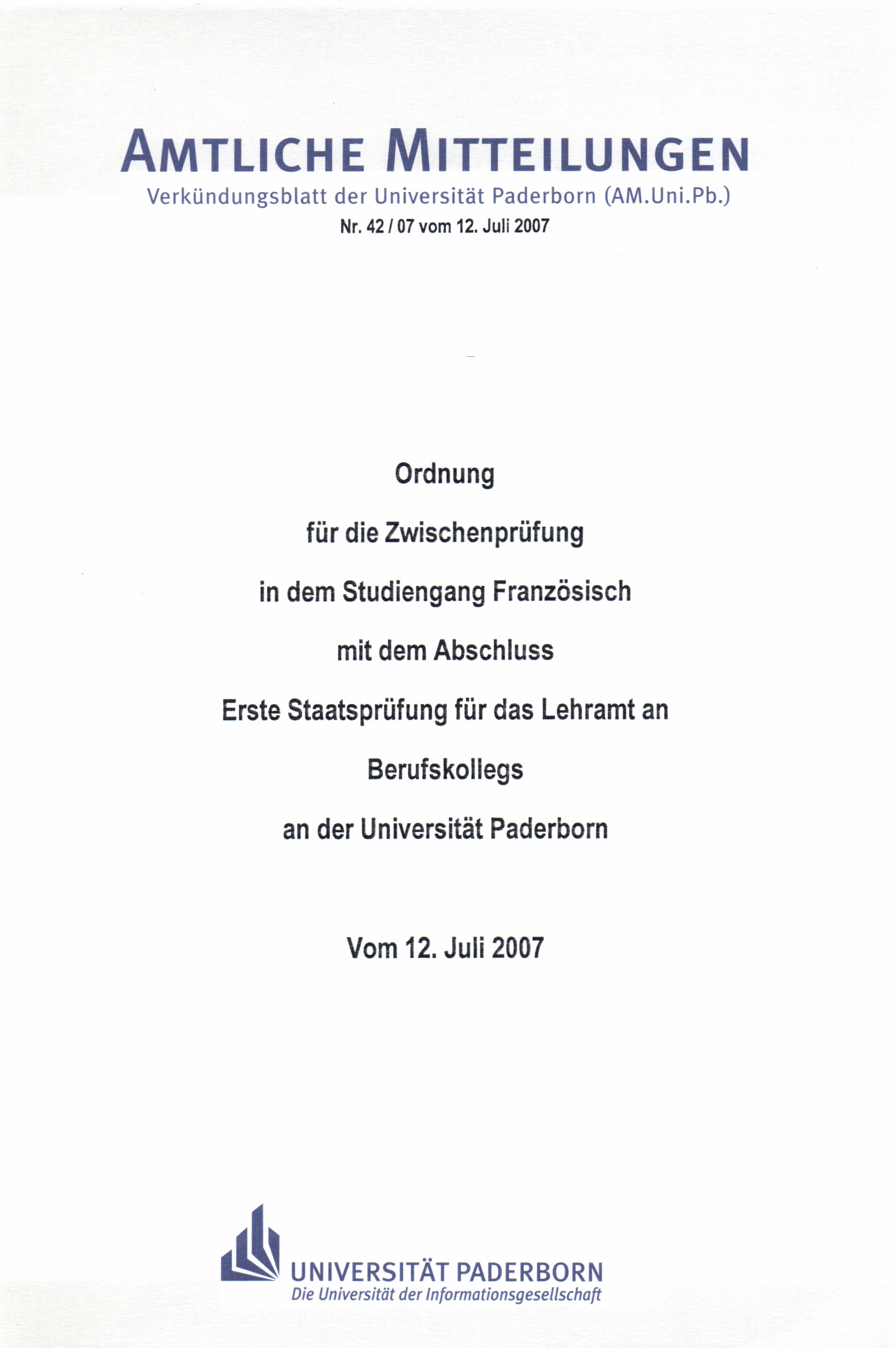Ordnung für die Zwischenprüfung in dem Studiengang Französisch mit dem Abschluss Erste Staatsprüfung für das Lehramt an Berufskollegs an der Universität Paderborn : vom 12. Juli 2007