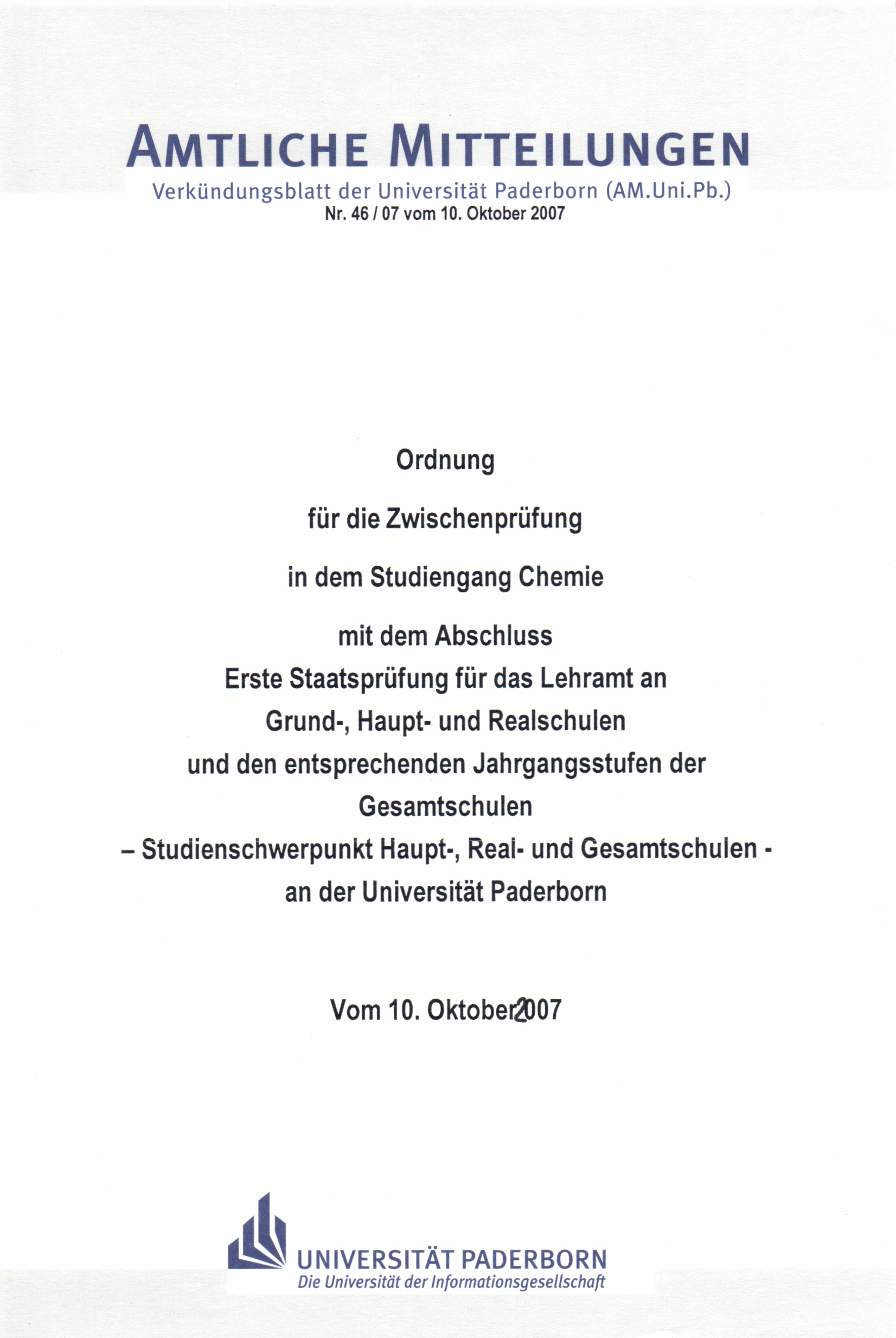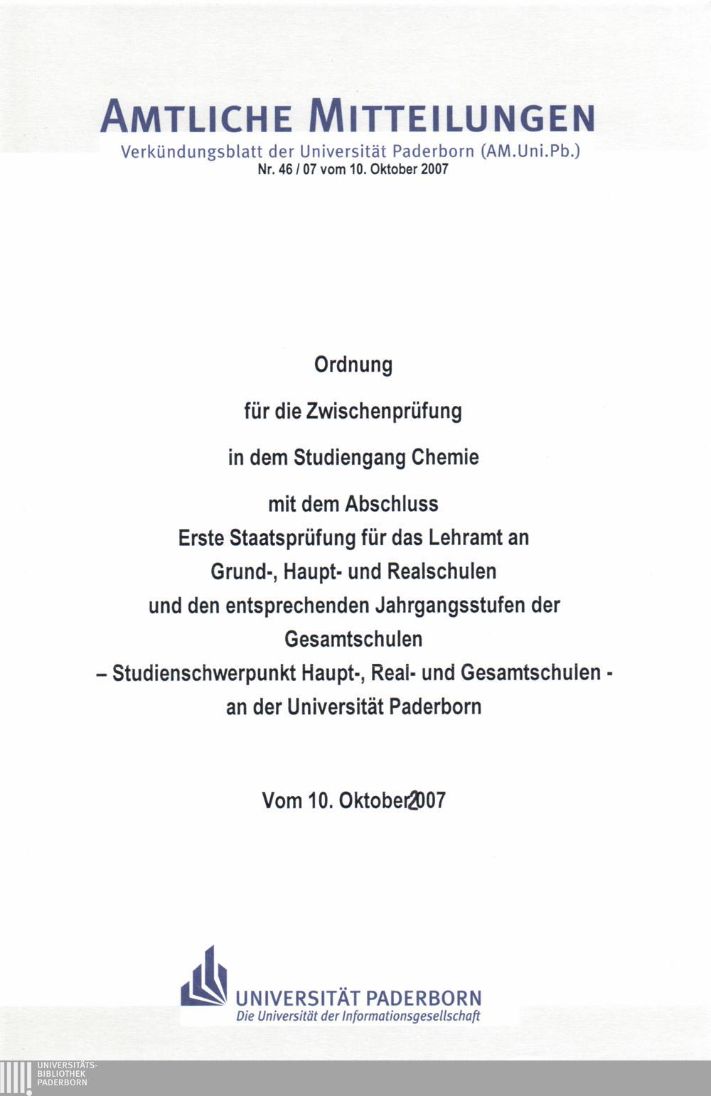Ordnung für die Zwischenprüfung in dem Studiengang Chemie mit dem Abschluss Erste Staatsprüfung für das Lehramt an Grund-, Haupt- und Realschulen und den entsprechenden Jahrgangsstufen der Gesamtschulen - Studienschwerpunkt Haupt-, Real- und Gesamtschulen - an der Universität Paderborn : vom 10. Oktober 2007