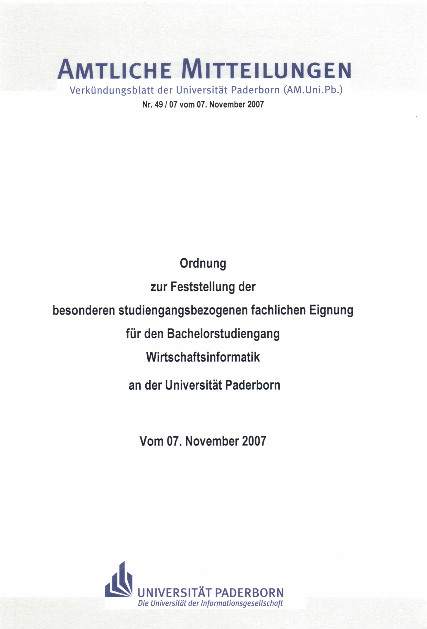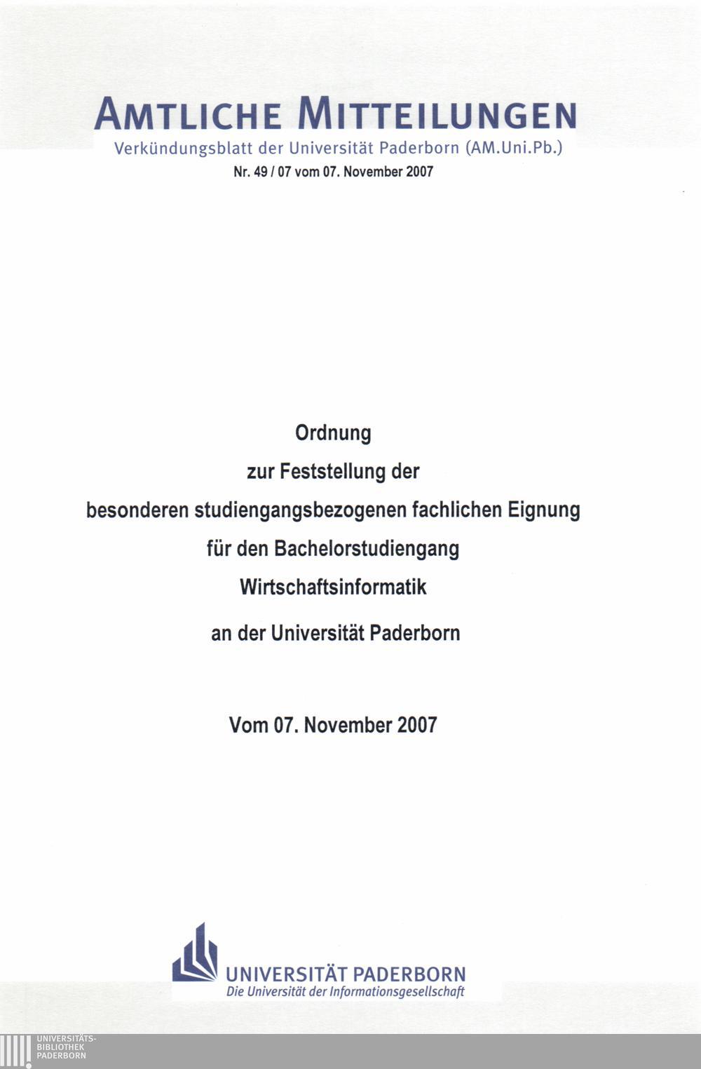 Ordnung zur Feststellung der besonderen studiengangsbezogenen fachlichen Eignung für den Bachelorstudiengang Wirtschaftsinformatik an der Universität Paderborn : vom 07. November 2007
