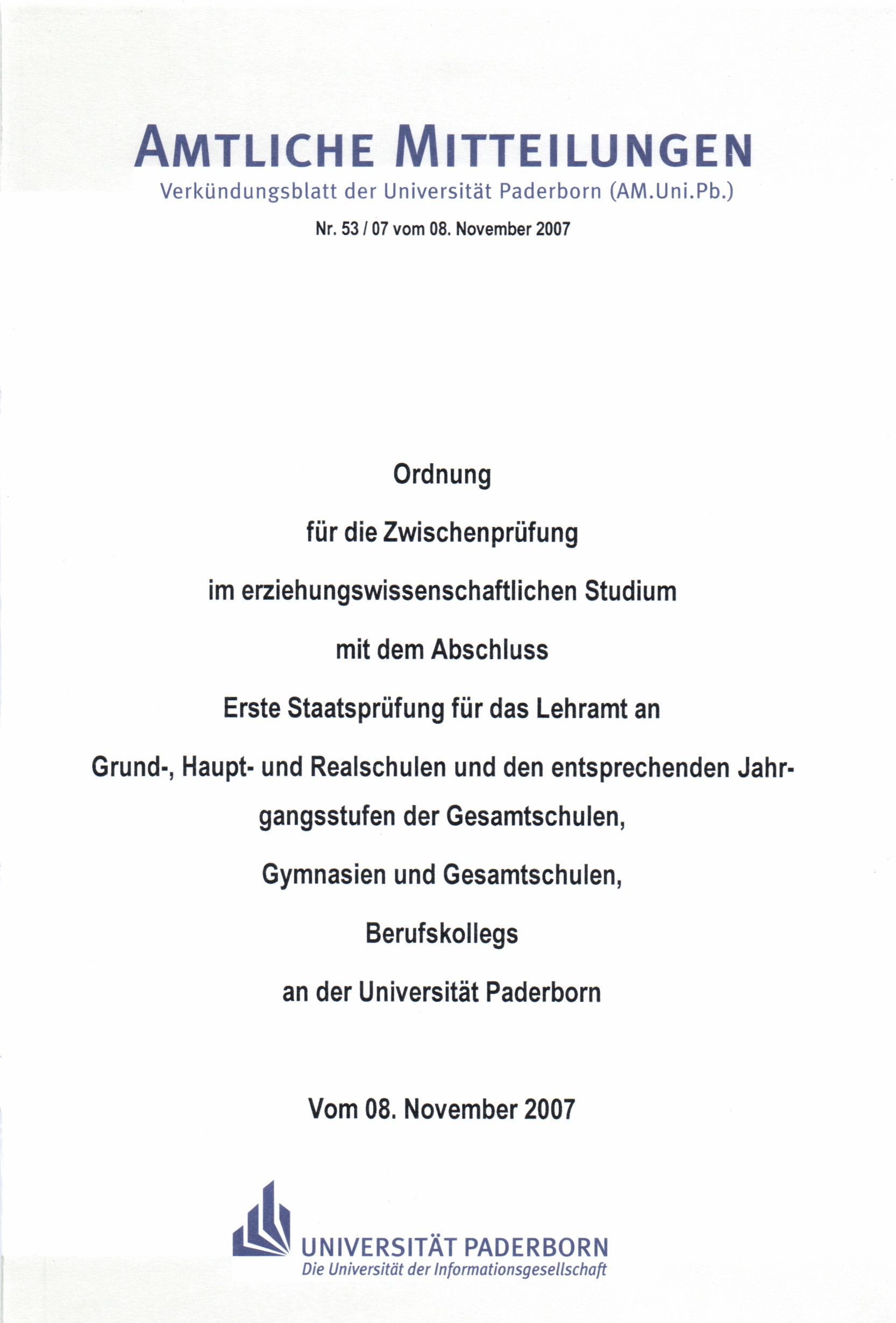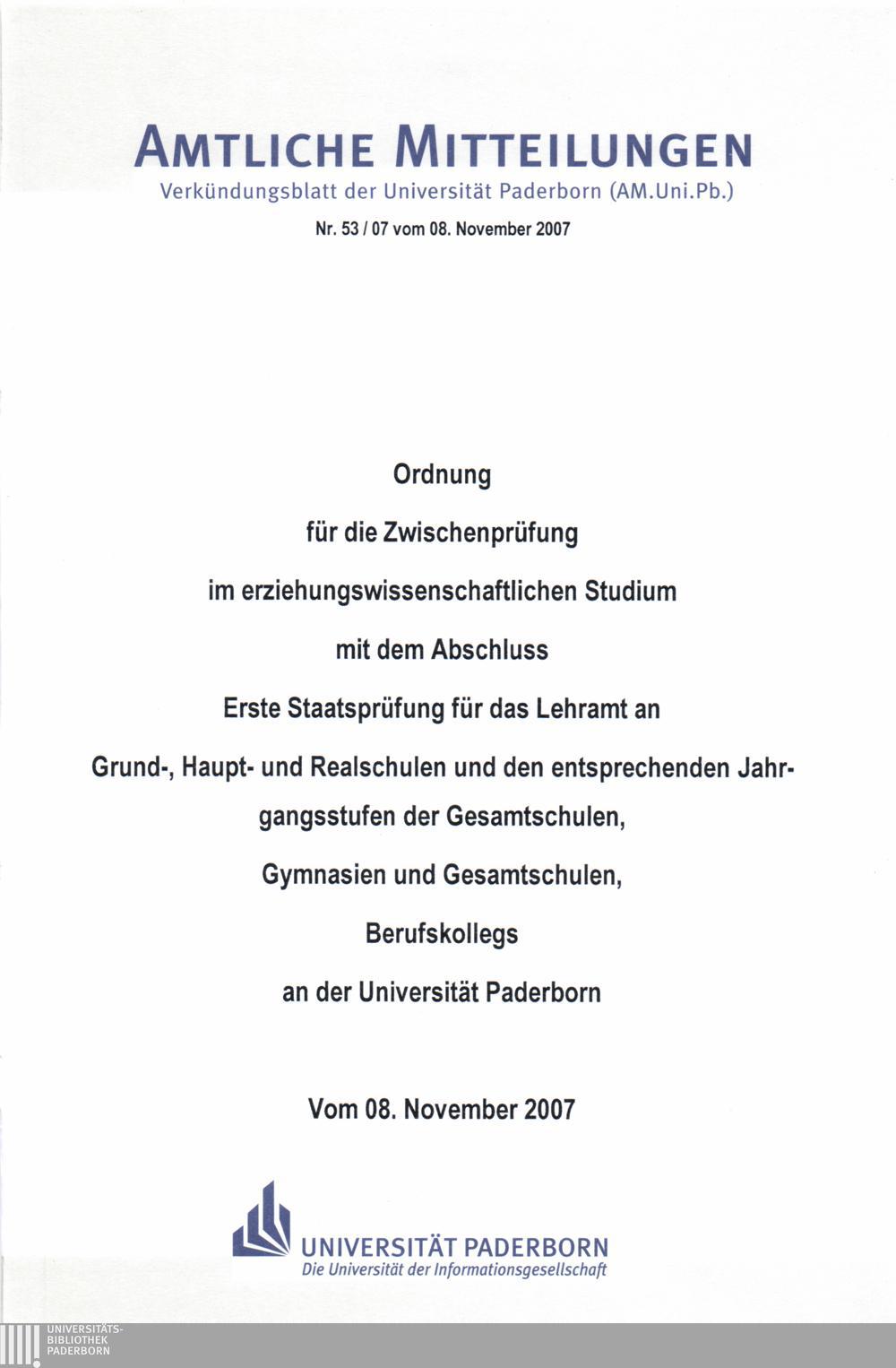 Ordnung für die Zwischenprüfung im erziehungswissenschaftlichen Studium mit dem Abschluss Erste Staatsprüfung für das Lehramt an Grund-, Haupt- und Realschulen und den entsprechenden Jahrgangsstufen der Gesamtschulen, Gymnasien und Gesamtschulen, Berufskollegs an der Universität Paderborn : vom 08. November 2007