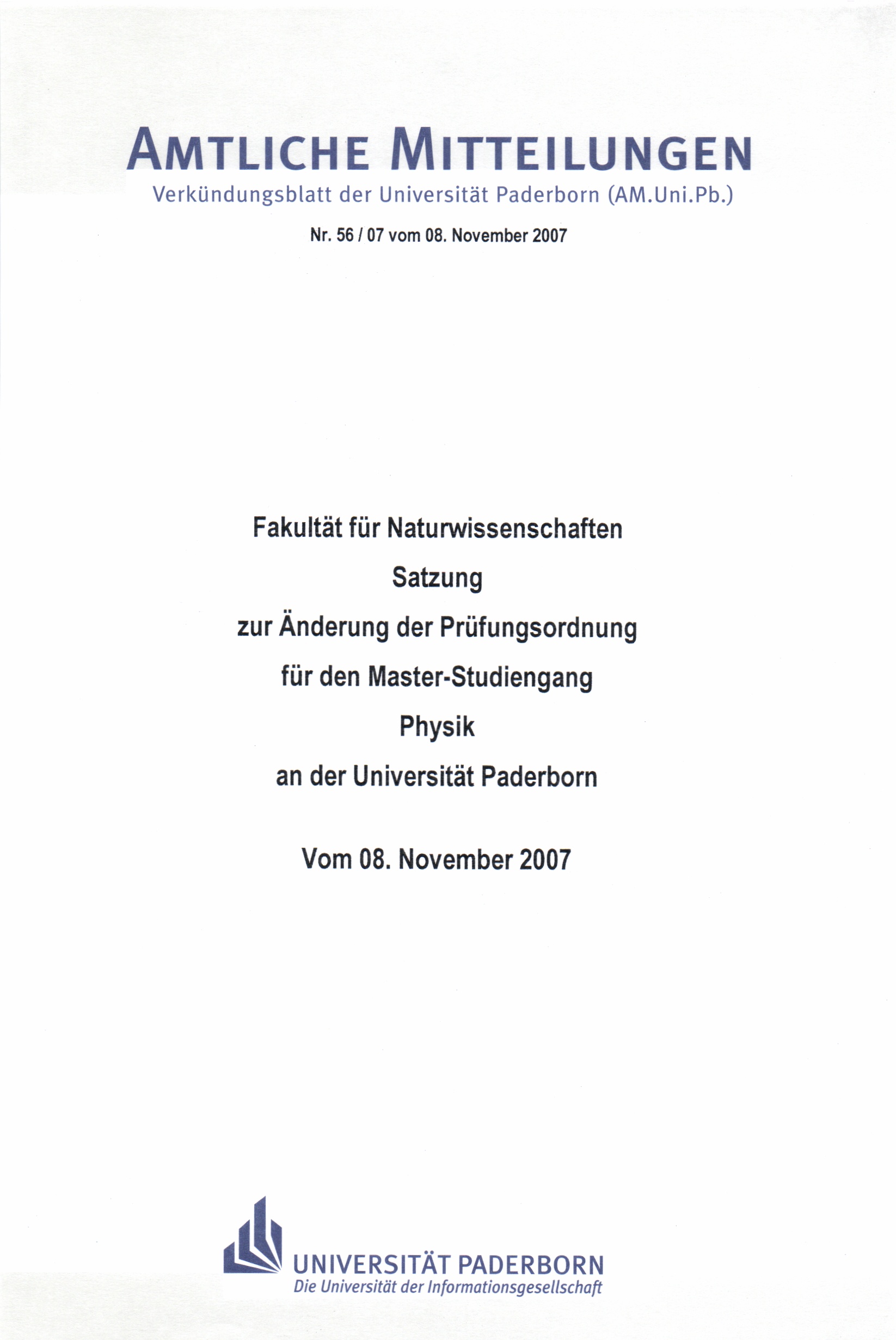 Satzung zur Änderung der Prüfungsordnung für den Master-Studiengang Physik an der Universität Paderborn : vom 08. November 2007 / Fakultät für Kulturwissenschaften