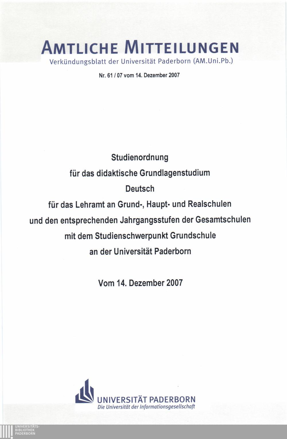Studienordnung für das didaktische Grundlagenstudium Deutsch für das Lehramt an Grund-, Haupt- und Realschulen und den entsprechenden Jahrgangsstufen der Gesamtschulen mit dem Studienschwerpunkt Grundschule an der Universität Paderborn : vom 14. Dezember 2007