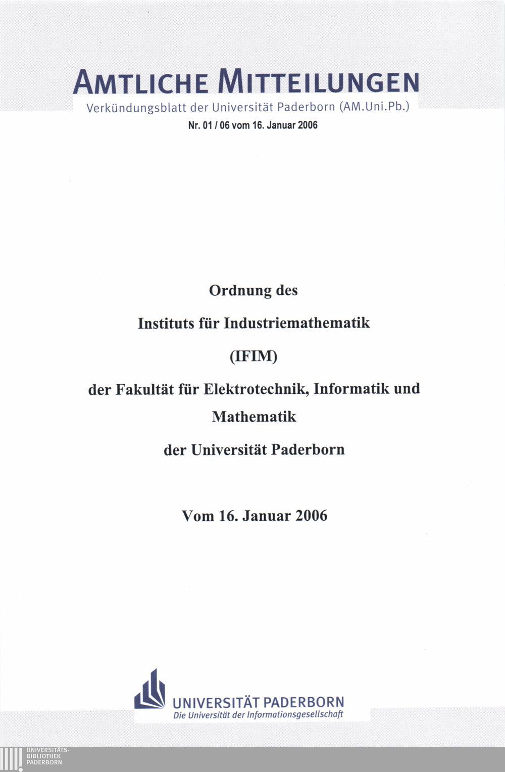 Ordnung des Instituts für Industriemathematik (IFIM) der Fakultät für Elektrotechnik, Informatik und Mathematik der Universität Paderborn : vom 16. Januar 2006