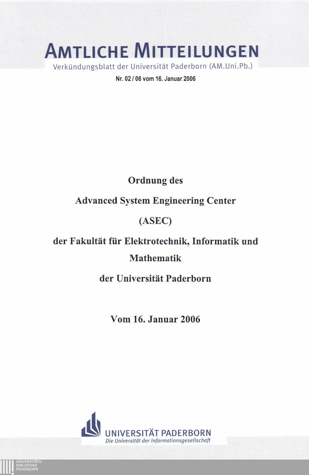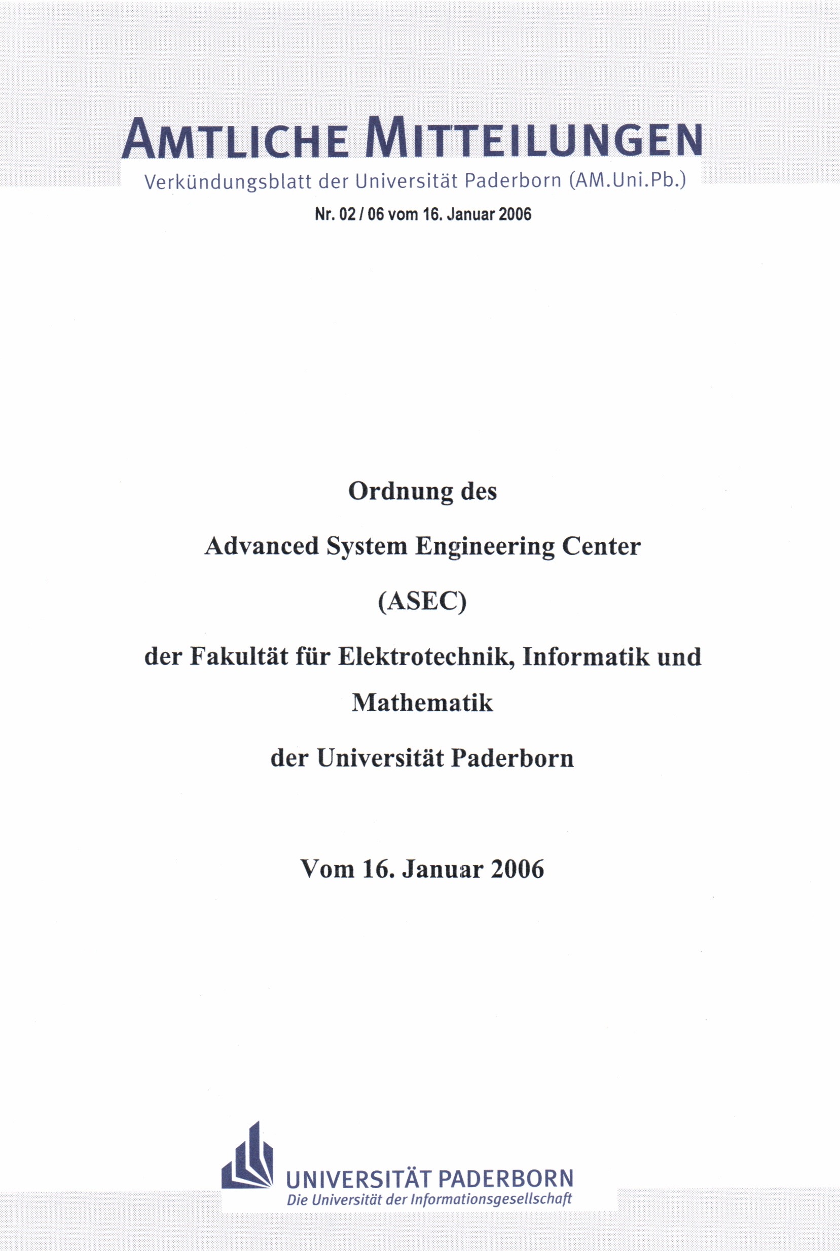 Ordnung des Advanced System Engineering Center (ASEC) der Fakultät für Elektrotechnik, Informatik und Mathematik der Universität Paderborn : vom 16. Januar 2006