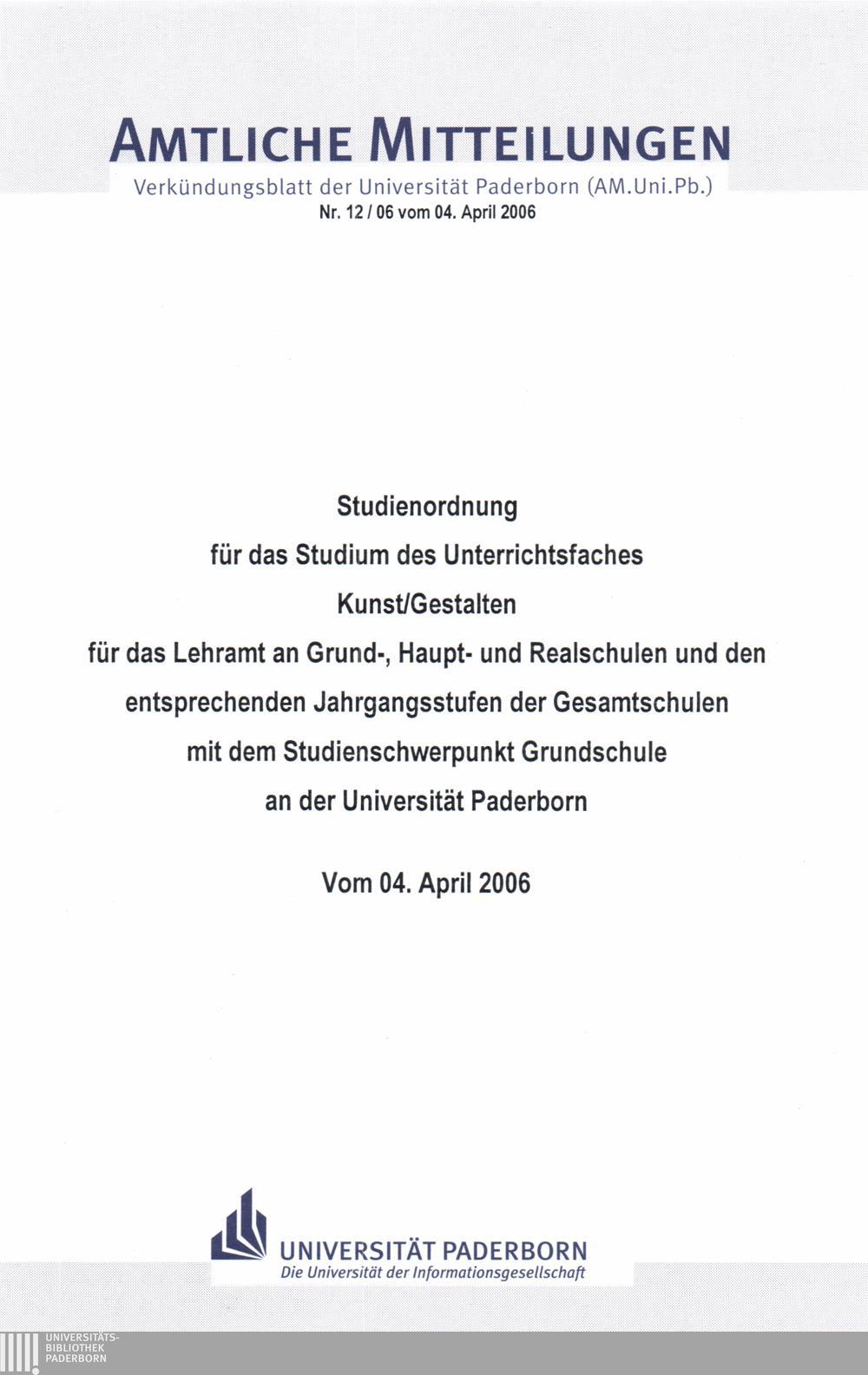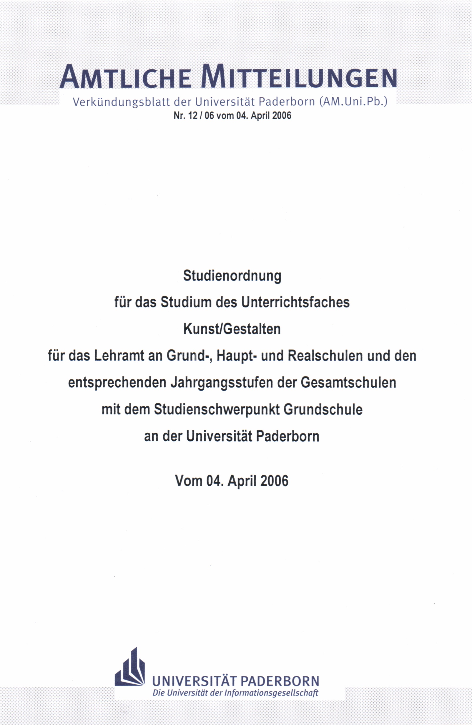 Studienordnung für das Studium des Unterrichtsfaches Kunst, Gestalten für das Lehramt an Grund-, Haupt- und Realschulen und den entsprechenden Jahrgangsstufen der Gesamtschulen mit dem Studienschwerpunkt Grundschule an der Universität Paderborn : vom 04. April 2006