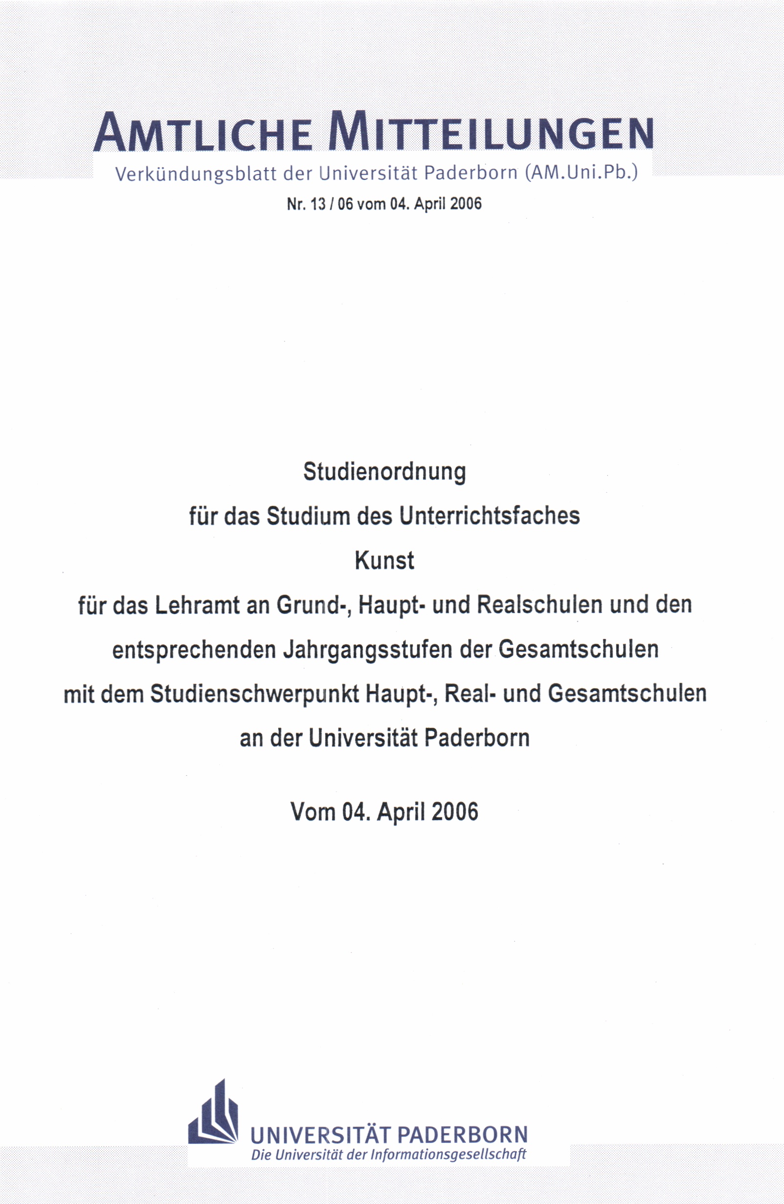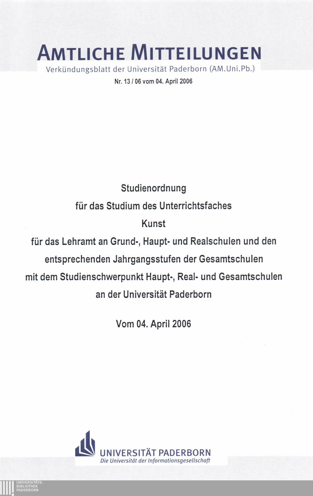 Studienordnung für das Studium des Unterrichtsfaches Kunst für das Lehramt an Grund-, Haupt- und Realschulen und den entsprechenden Jahrgangsstufen der Gesamtschulen mit dem Studienschwerpunkt Haupt-, Real- und Gesamtschulen an der Universität Paderborn : vom 04. April 2006