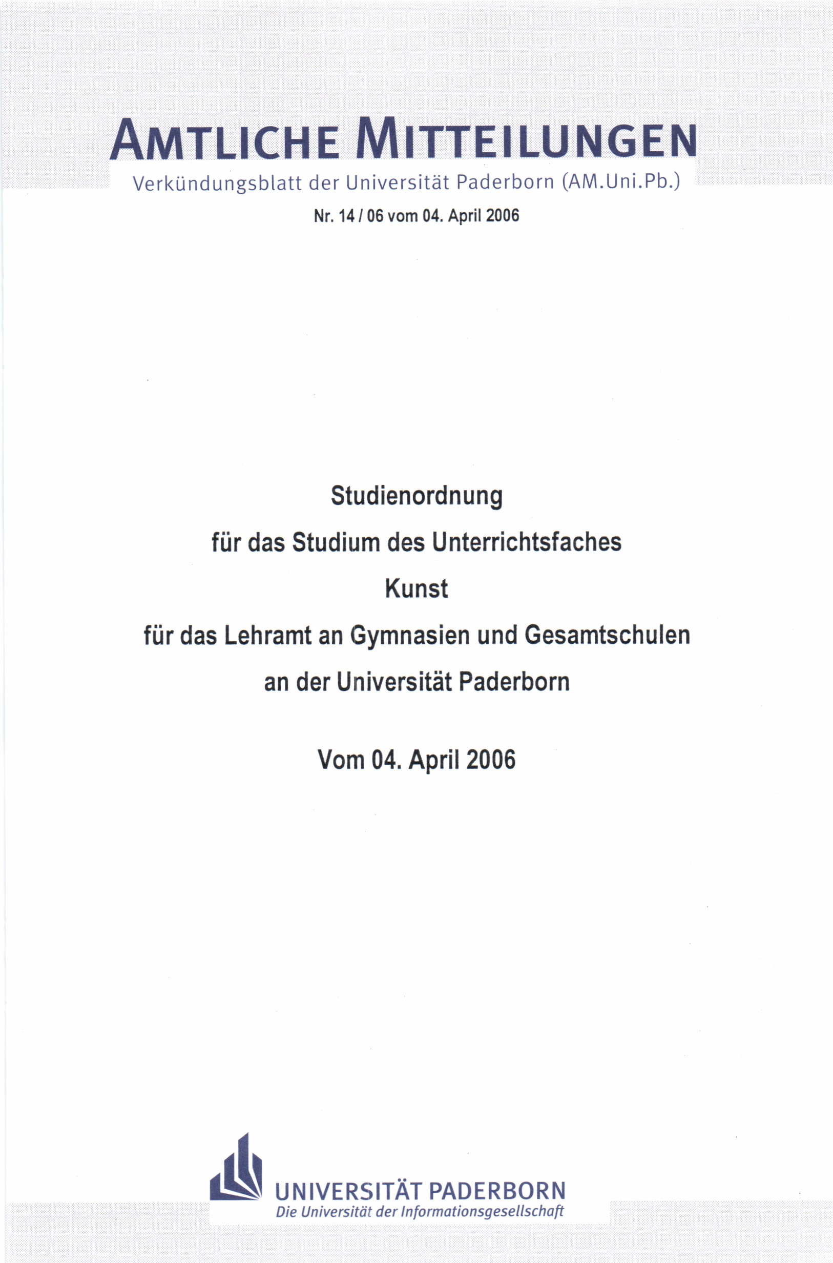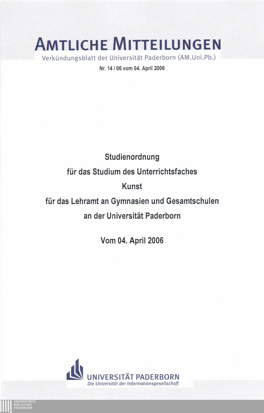 Studienordnung für das Studium des Unterrichtsfaches Kunst für das Lehramt an Gymnasien und Gesamtschulen an der Universität Paderborn : vom 04. April 2006