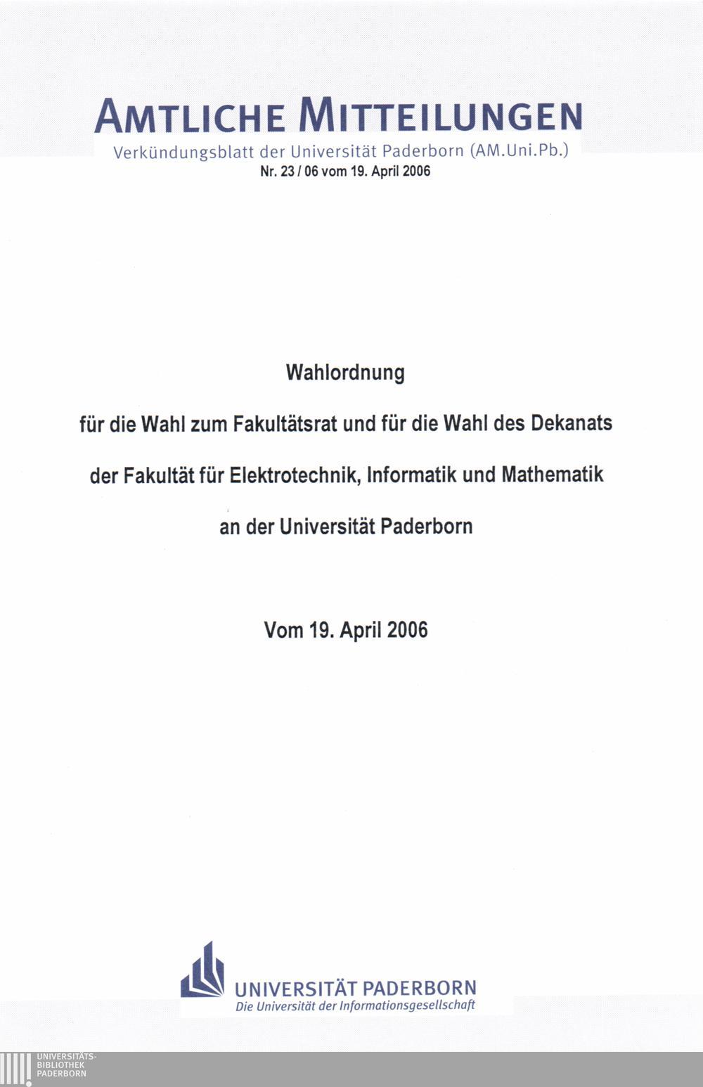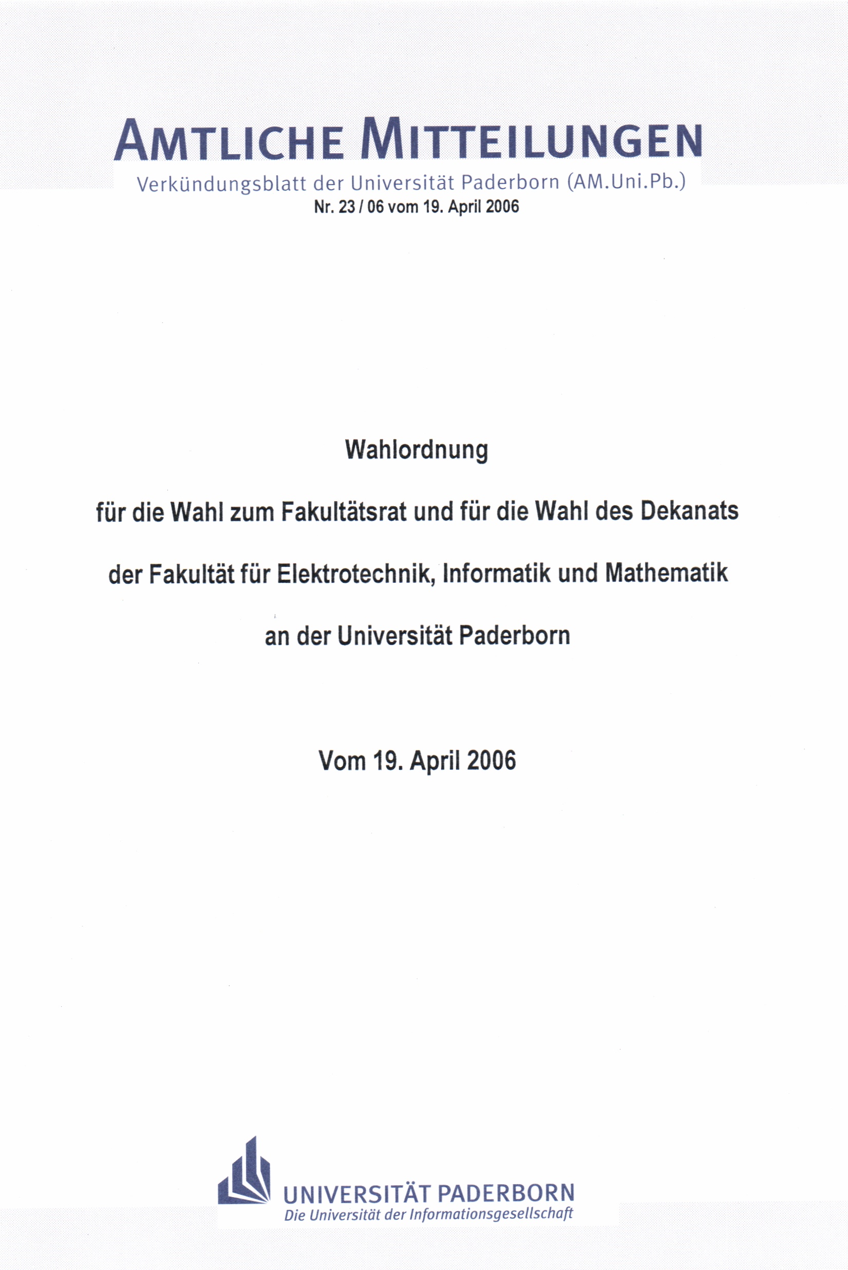Wahlordnung für die Wahl zum Fakultätsrat und für die Wahl des Dekanats der Fakultät für Elektrotechnik, Informatik und Mathematik an der Universität Paderborn : vom 19. April 2006