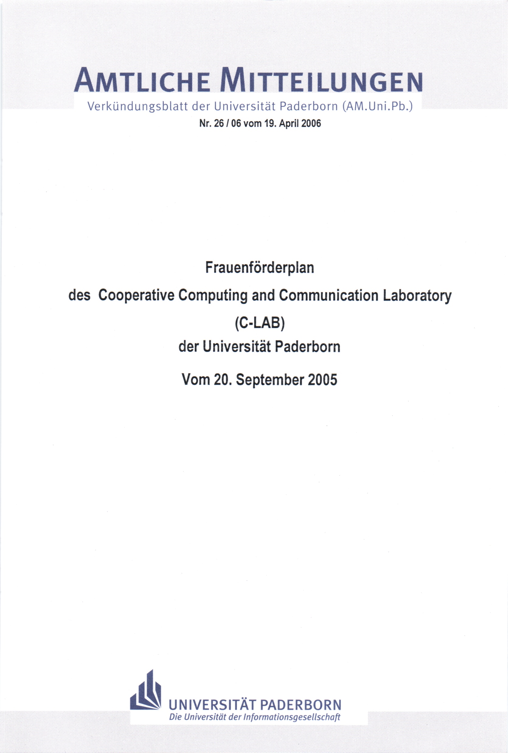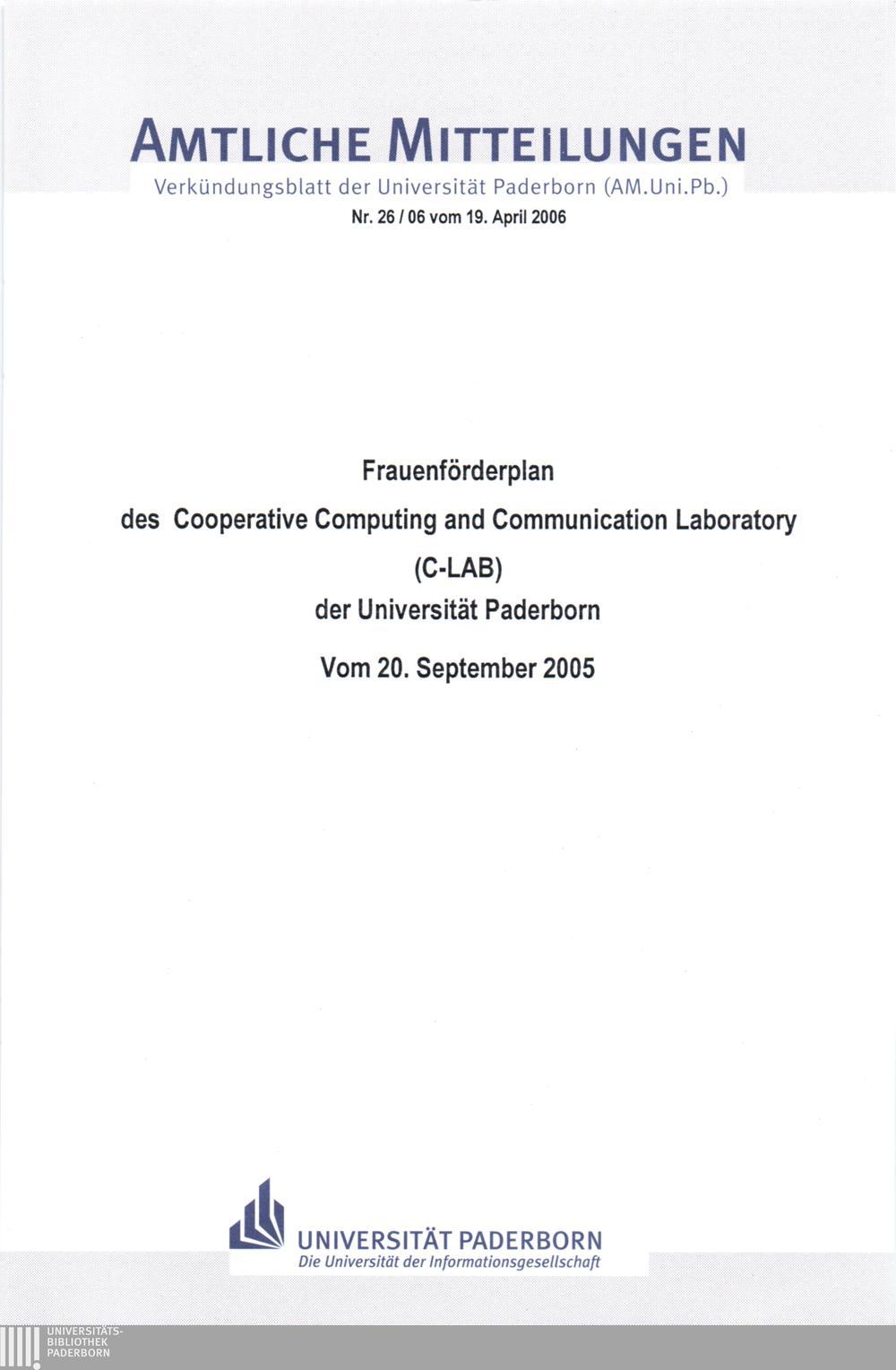 Frauenförderplan des Cooperative Computing and Communication Laboratory (C-LAB) der Universität Paderborn : (mit statistischem Anhang) ; vom 20. September 2005