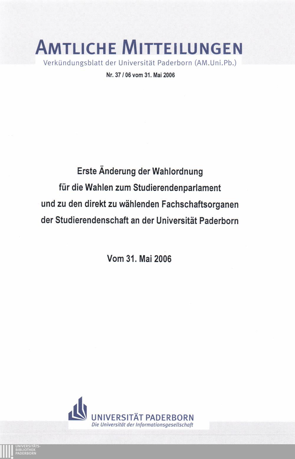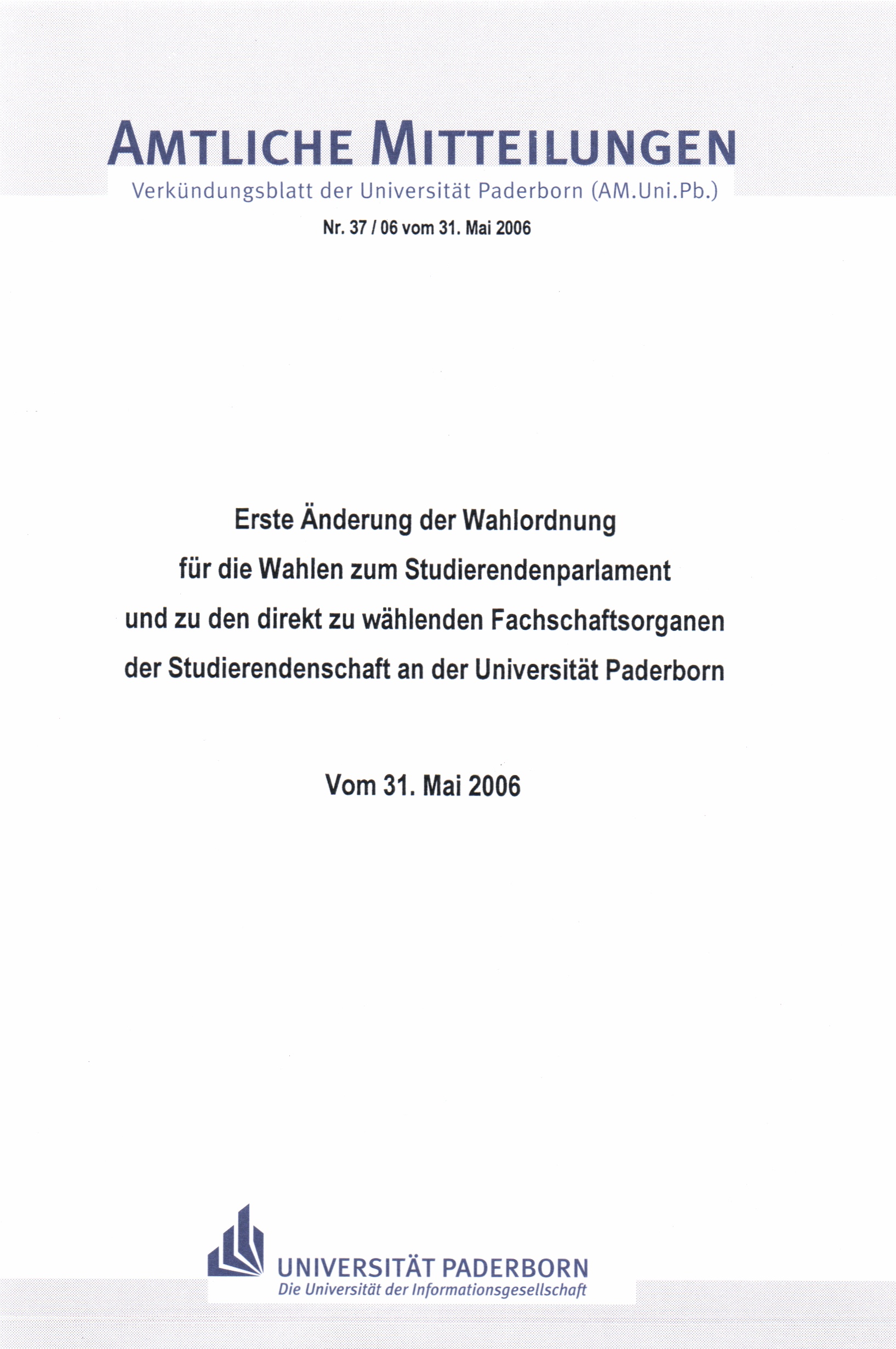 Erste Änderung der Wahlordnung für die Wahlen zum Studierendenparlament und zu den direkt zu wählenden Fachschaftsorganen der Studierendenschaft an der Universität Paderborn : vom 31. Mai 2006