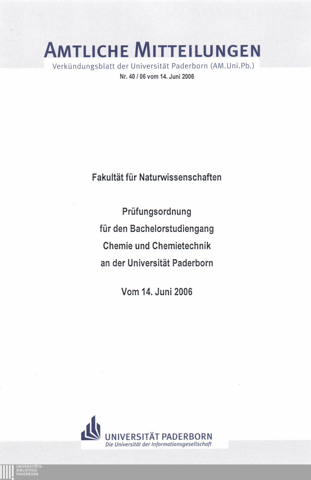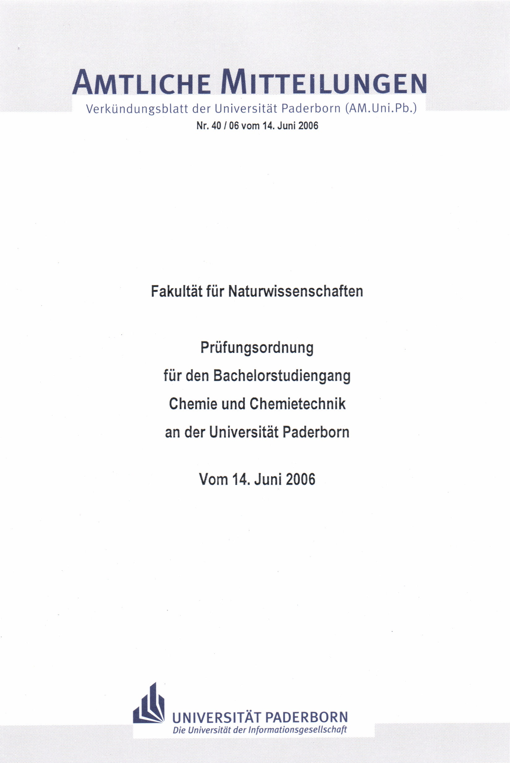 Prüfungsordnung für den Bachelorstudiengang Chemie und Chemietechnik an der Universität Paderborn : vom 14. Juni 2006 / Fakultät für Naturwissenschaften