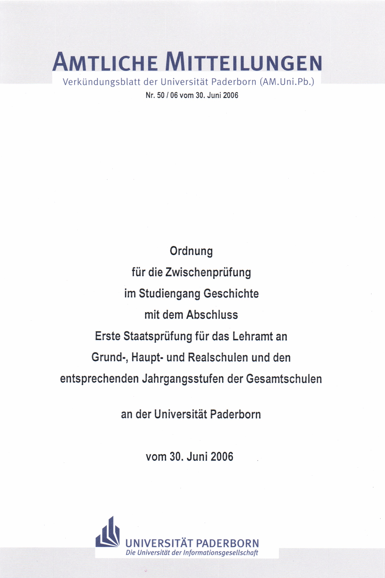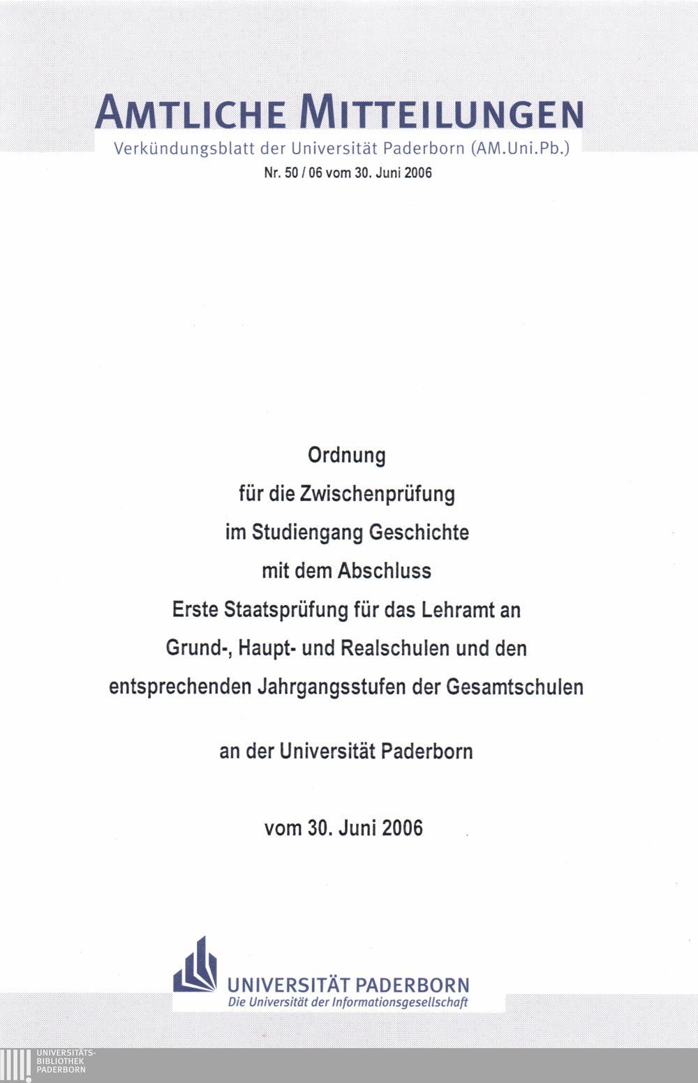 Ordnung für die Zwischenprüfung im Studiengang Geschichte mit dem Abschluss Erste Staatsprüfung für das Lehramt an Grund-, Haupt- und Realschulen und den entsprechenden Jahrgangsstufen der Gesamtschulen an der Universität Paderborn : vom 30. Juni 2006