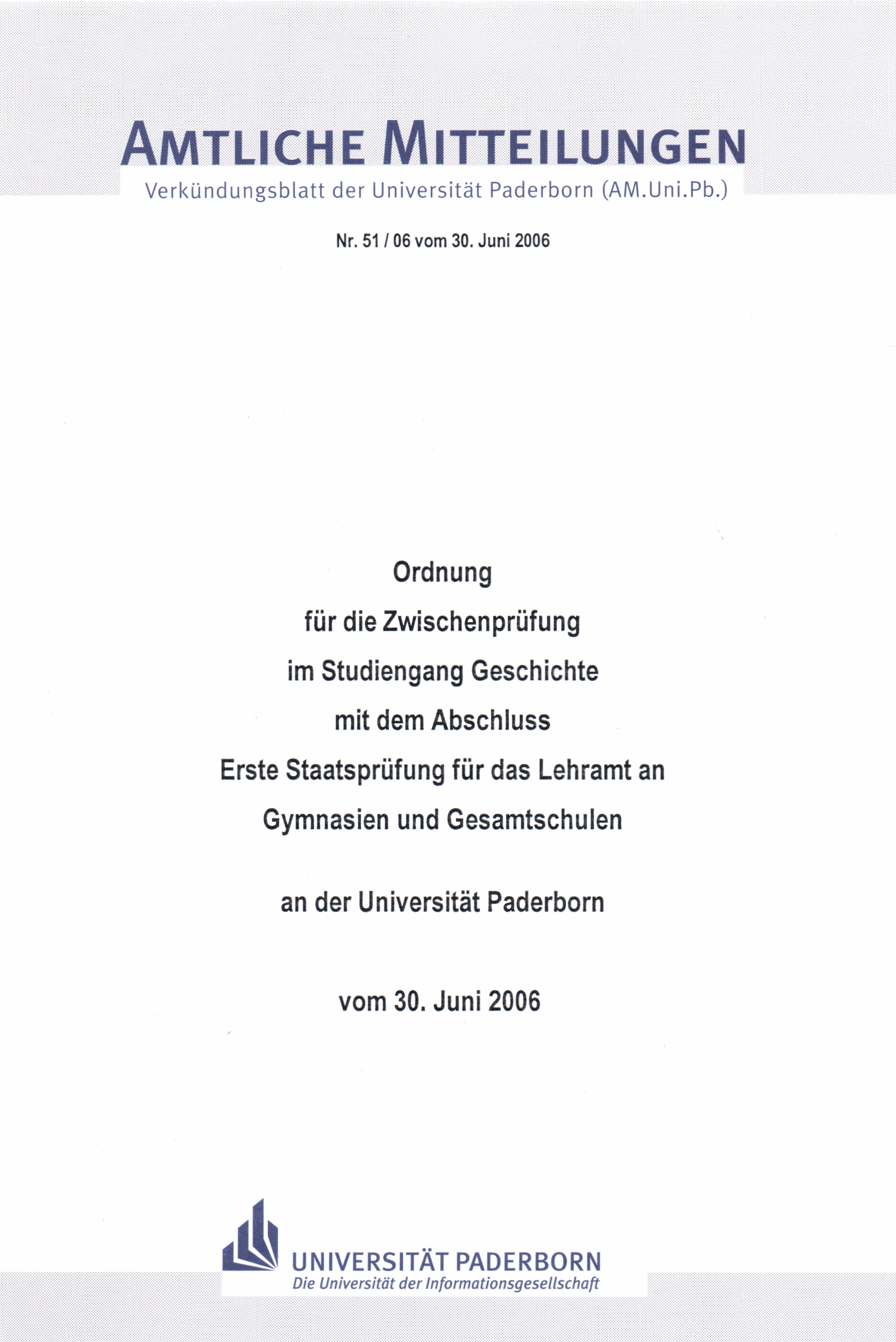 Ordnung für die Zwischenprüfung im Studiengang Geschichte mit dem Abschluss Erste Staatsprüfung für das Lehramt an Gymnasien und Gesamtschulen an der Universität Paderborn : vom 30. Juni 2006