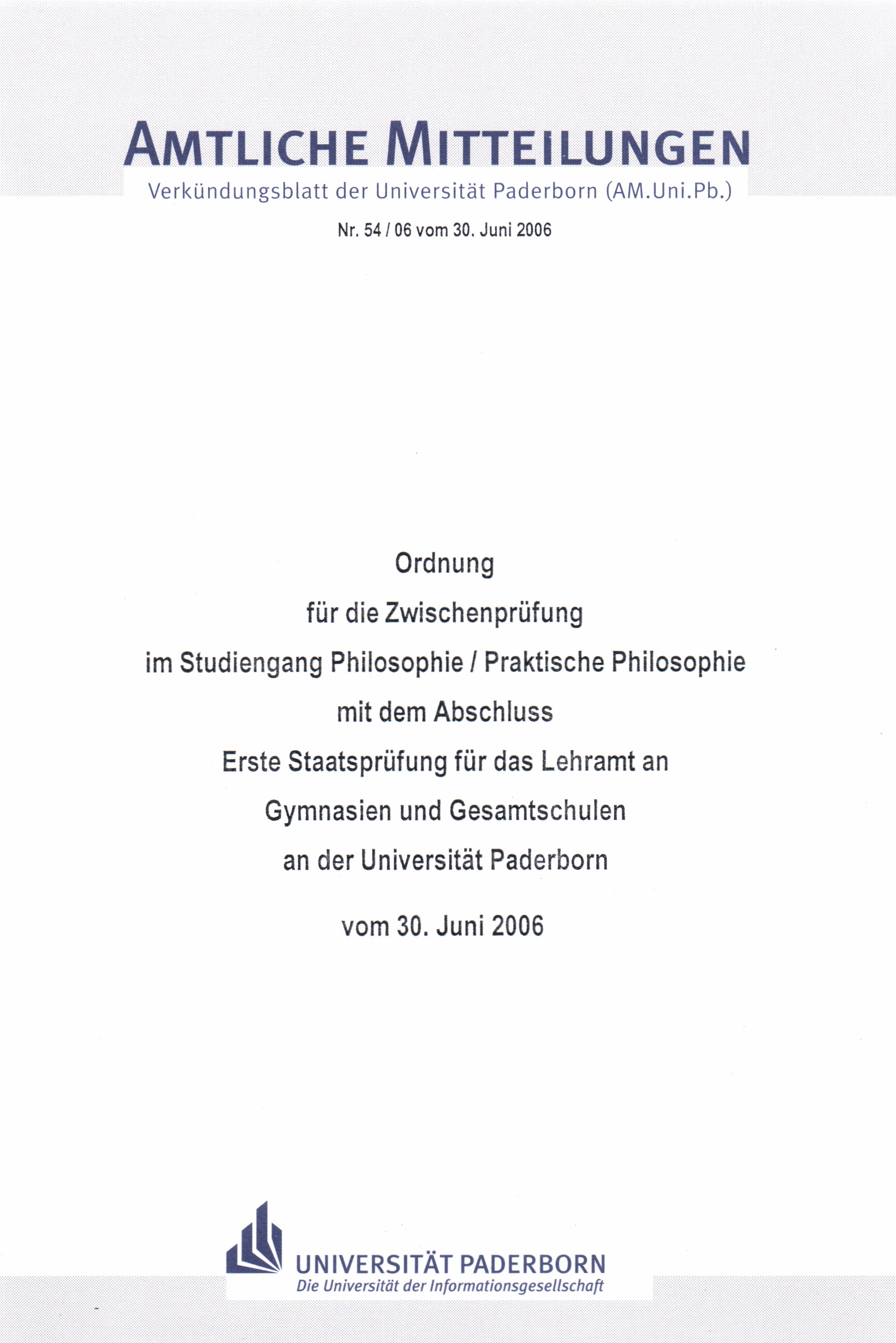 Ordnung für die Zwischenprüfung im Studiengang Philosophie, Praktische Philosophie mit dem Abschluss Erste Staatsprüfung für das Lehramt an Gymnasien und Gesamtschulen an der Universität Paderborn : vom 30. Juni 2006