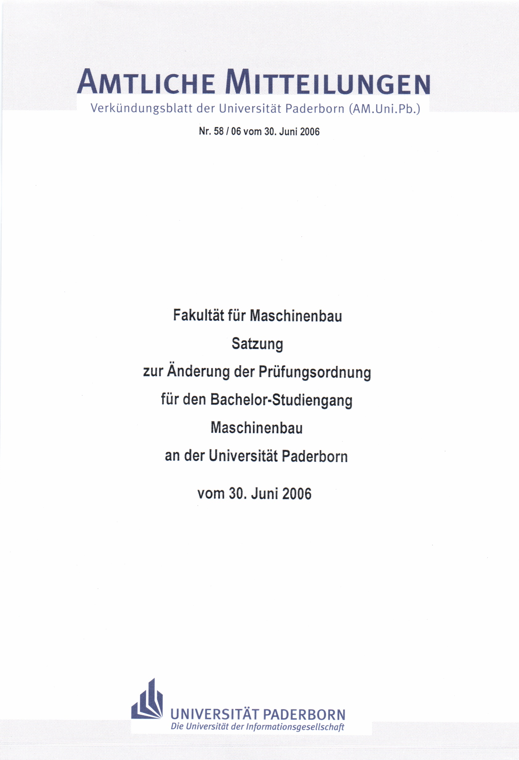 Satzung zur Änderung der Prüfungsordnung für den Bachelor-Studiengang Maschinenbau an der Universität Paderborn : vom 30. Juni 2006 / Fakultät für Maschinenbau