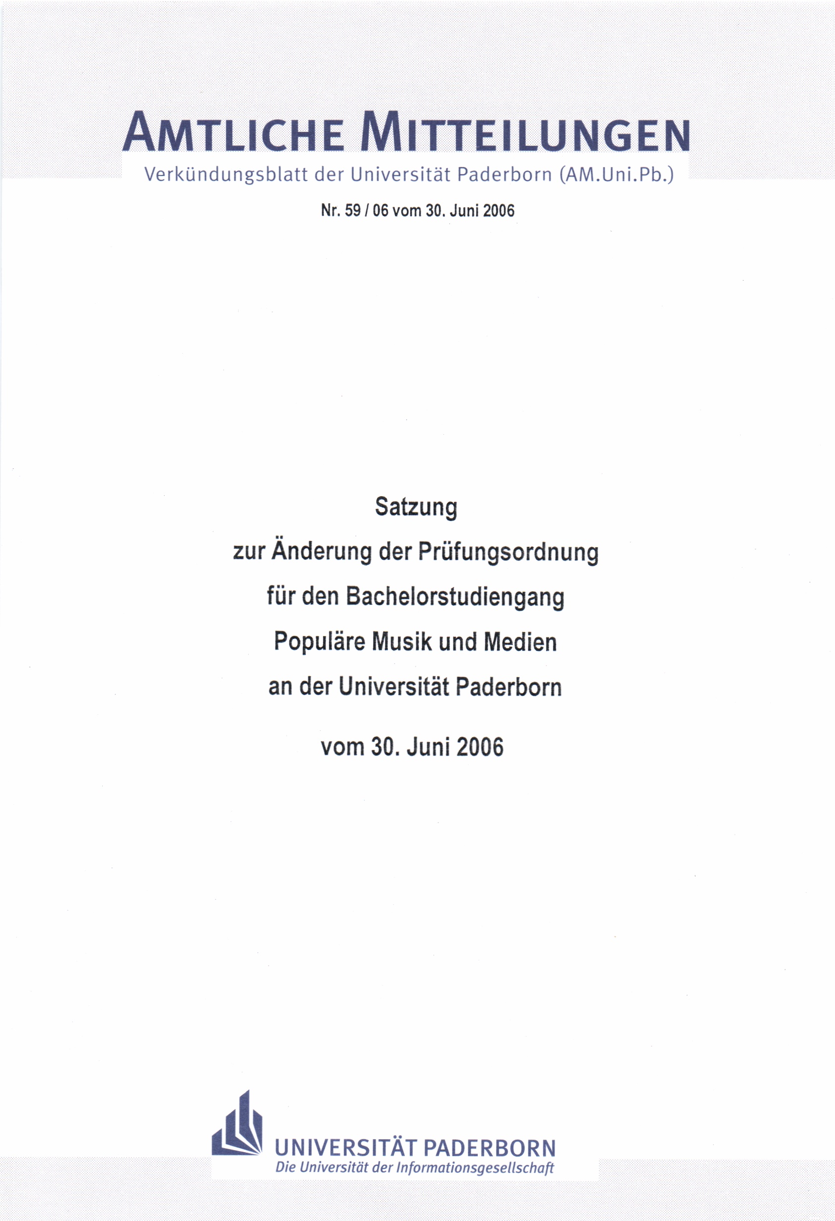 Satzung zur Änderung der Prüfungsordnung für den Bachelorstudiengang Populäre Musik und Medien an der Universität Paderborn : vom 30. Juni 2006