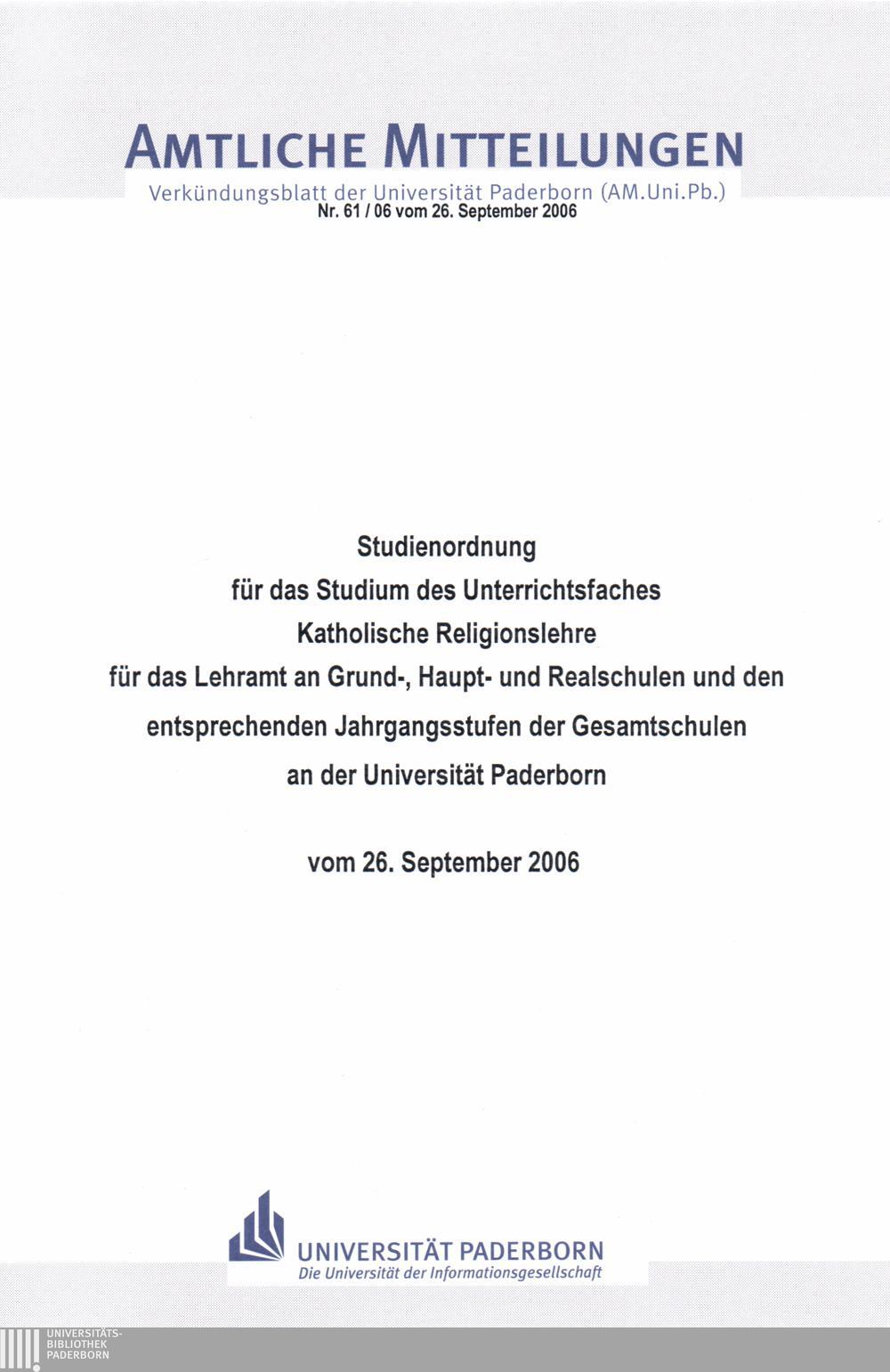 Studienordnung für das Studium des Unterrichtsfaches Katholische Religionslehre für das Lehramt an Grund-, Haupt- und Realschulen und den entsprechenden Jahrgangsstufen der Gesamtschulen an der Universität Paderborn : vom 26. September 2006