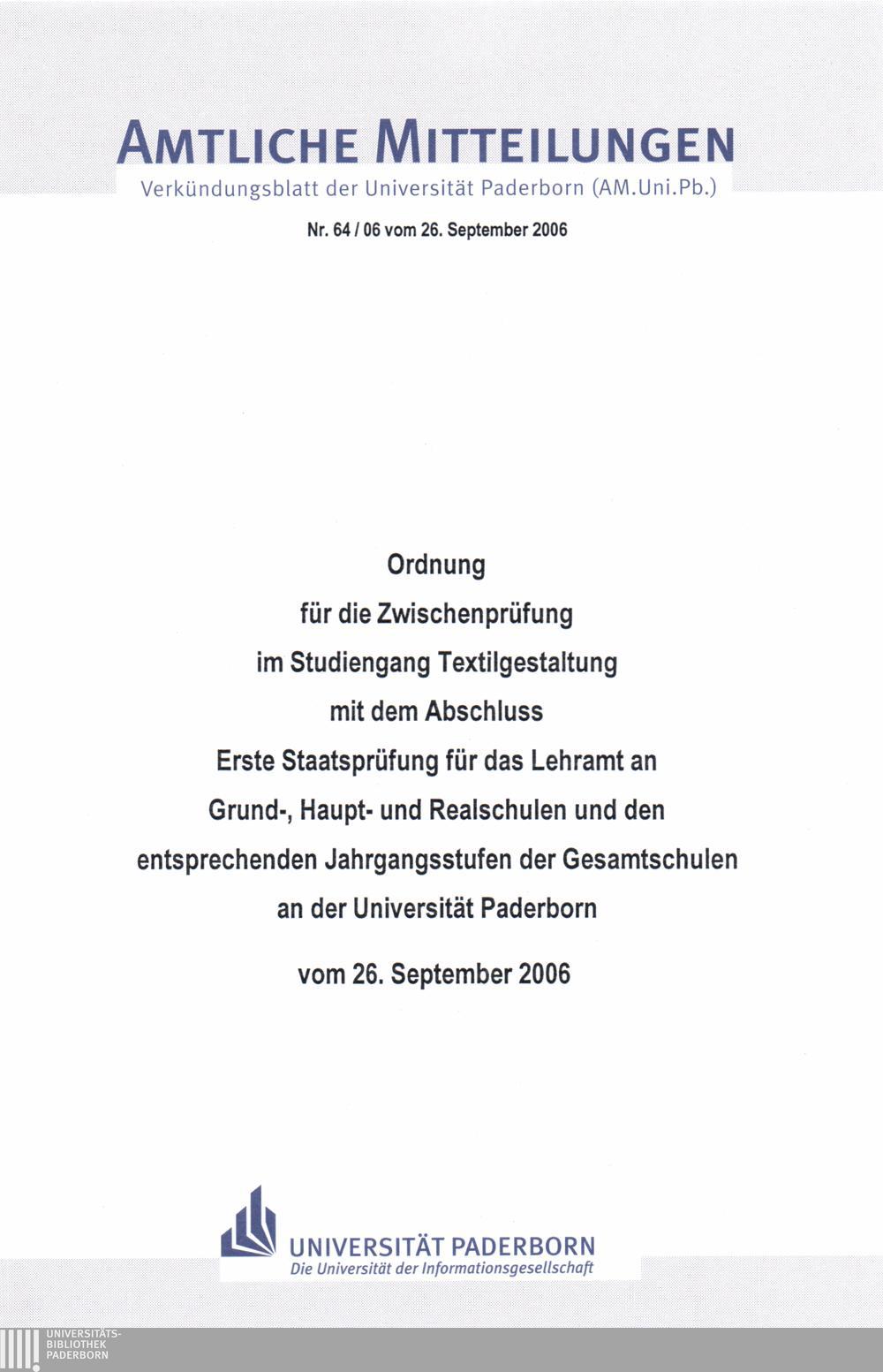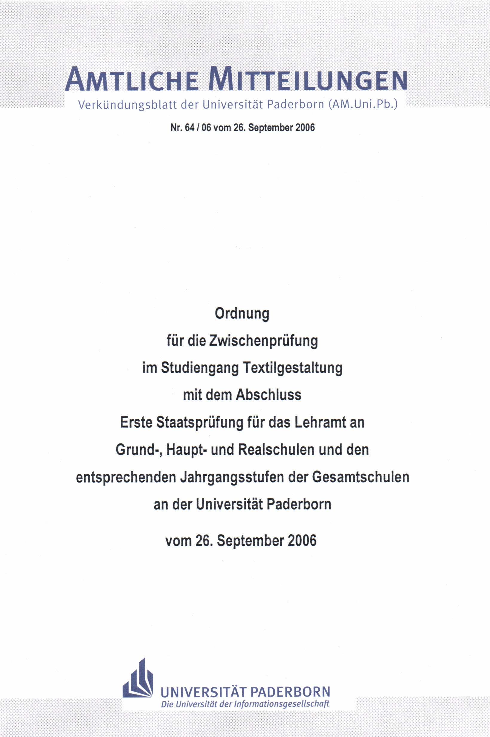 Ordnung für die Zwischenprüfung im Studiengang Textilgestaltung mit dem Abschluss Erste Staatsprüfung für das Lehramt an Grund-, Haupt- und Realschulen und den entsprechenden Jahrgangsstufen der Gesamtschulen an der Universität Paderborn : vom 26. September 2006