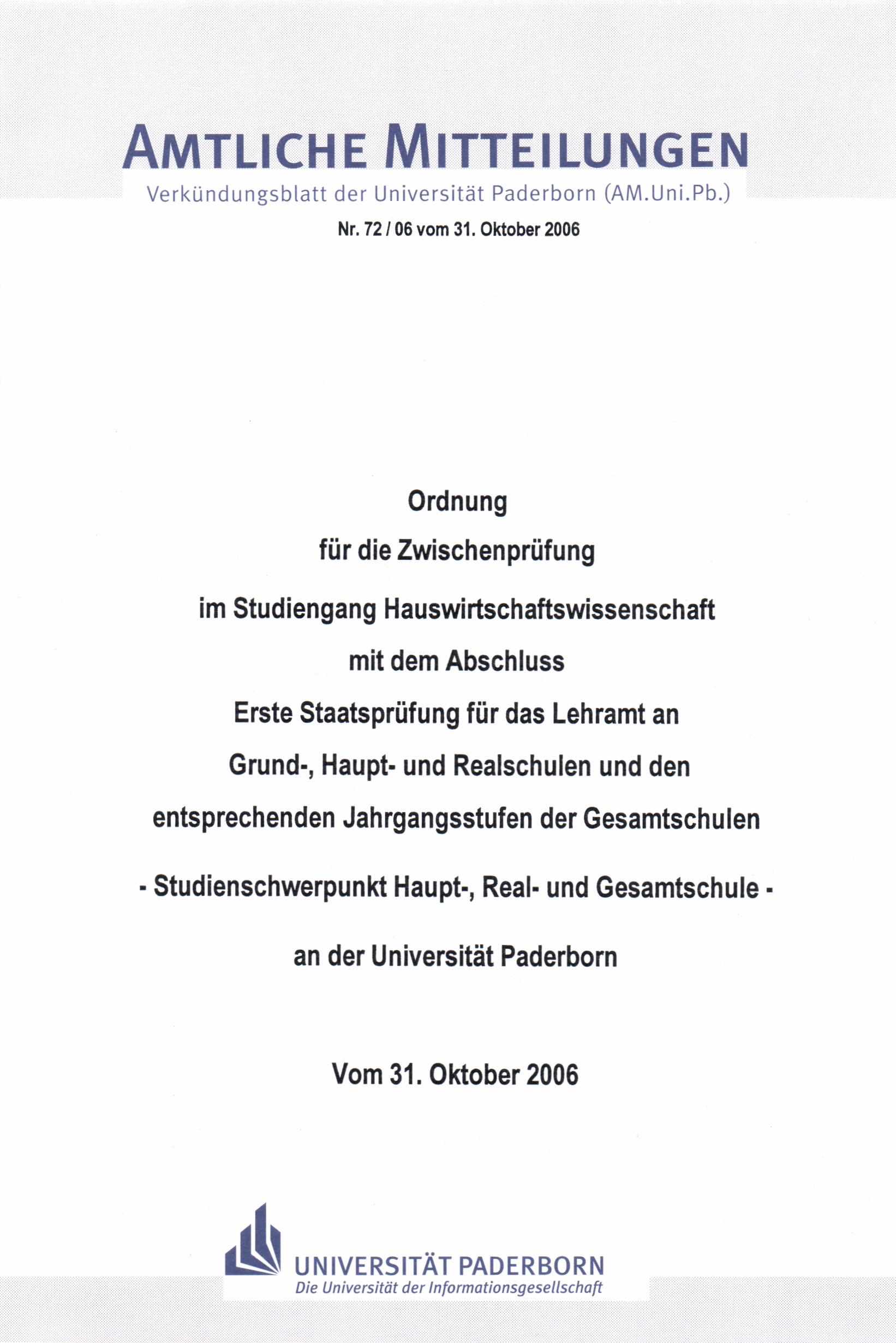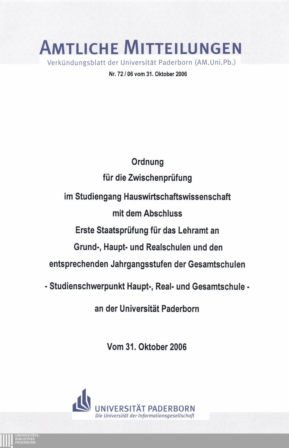 Ordnung für die Zwischenprüfung im Studiengang Hauswirtschaftswissenschaft mit dem Abschluss Erste Staatsprüfung für das Lehramt an Grund-, Haupt- und Realschulen und den entsprechenden Jahrgangsstufen der Gesamtschulen - Studienschwerpunkt Haupt-, Real- und Gesamtschule - an der Universität Paderborn : vom 31. Oktober 2006