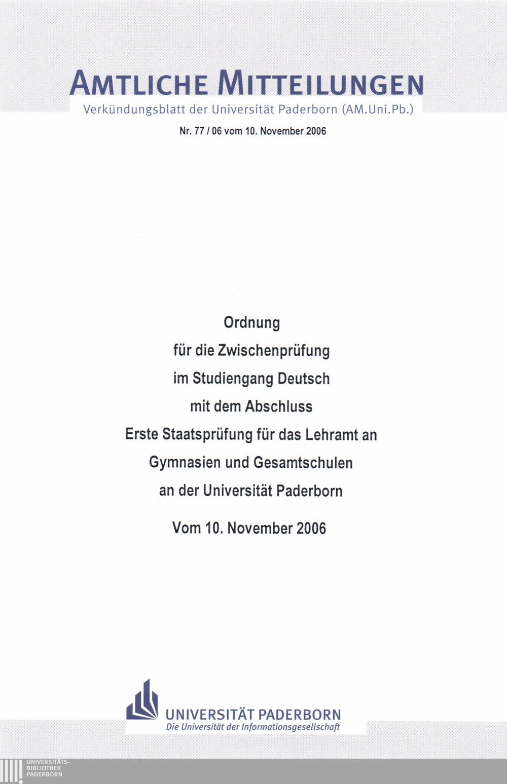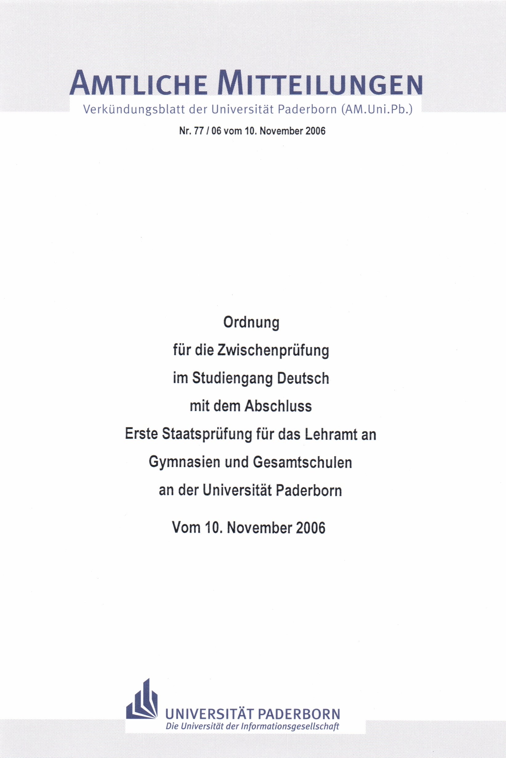 Ordnung für die Zwischenprüfung im Studiengang Deutsch mit dem Abschluss Erste Staatsprüfung für das Lehramt an Gymnasien und Gesamtschulen an der Universität Paderborn : vom 10. November 2006