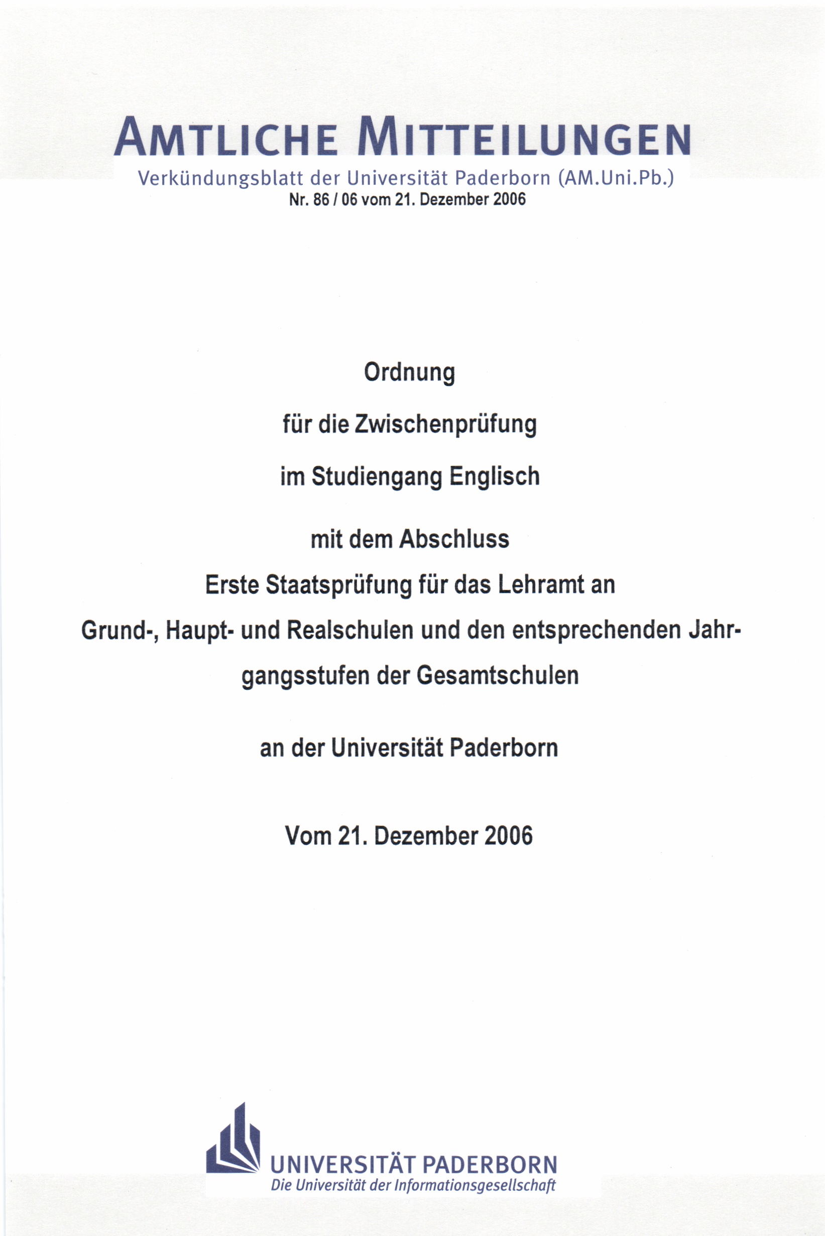 Ordnung für die Zwischenprüfung im Studiengang Englisch mit dem Abschluss Erste Staatsprüfung für das Lehramt an Grund-, Haupt- und Realschulen und den entsprechenden Jahrgangsstufen der Gesamtschulen an der Universität Paderborn : vom 21. Dezember 2006