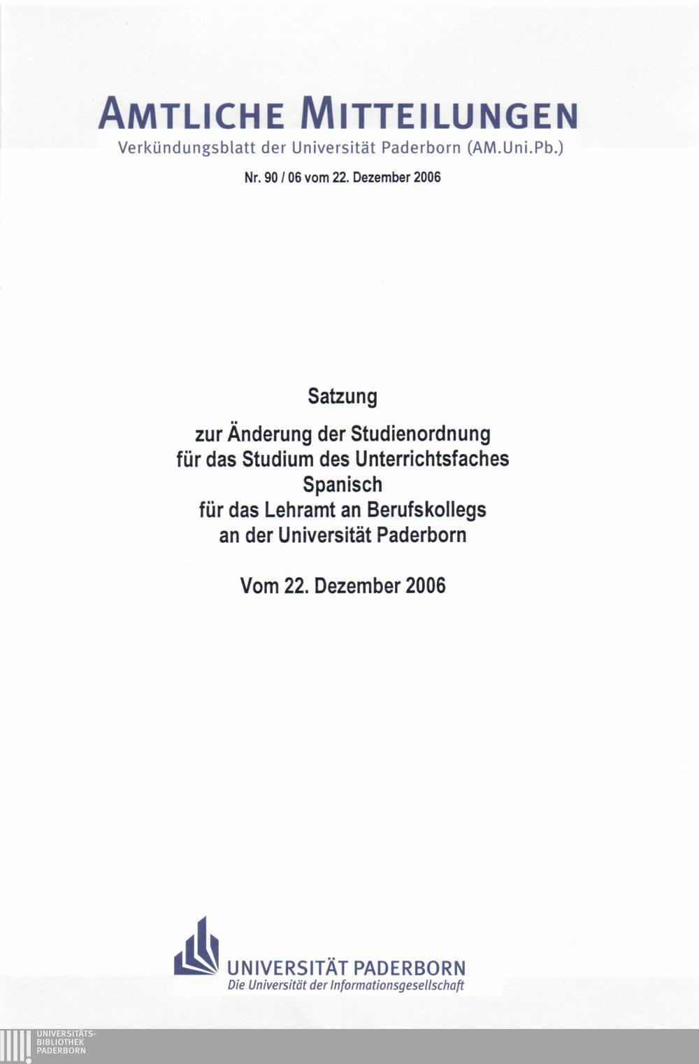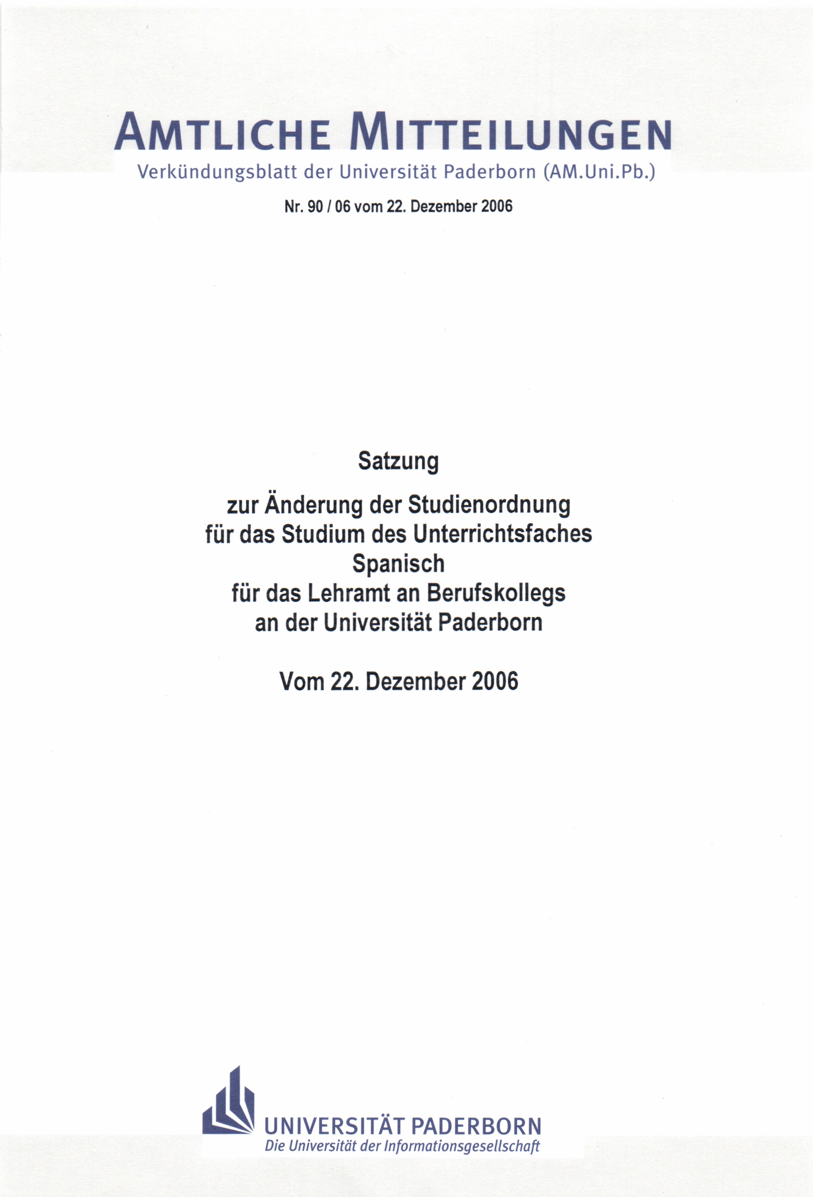 Satzung zur Änderung der Studienordnung für das Studium des Unterrichtsfaches Spanisch für das Lehramt an Berufskollegs an der Universität Paderborn : vom 22. Dezember 2006