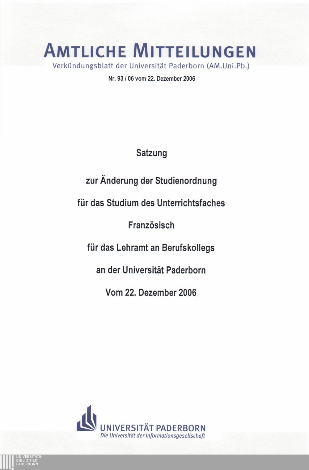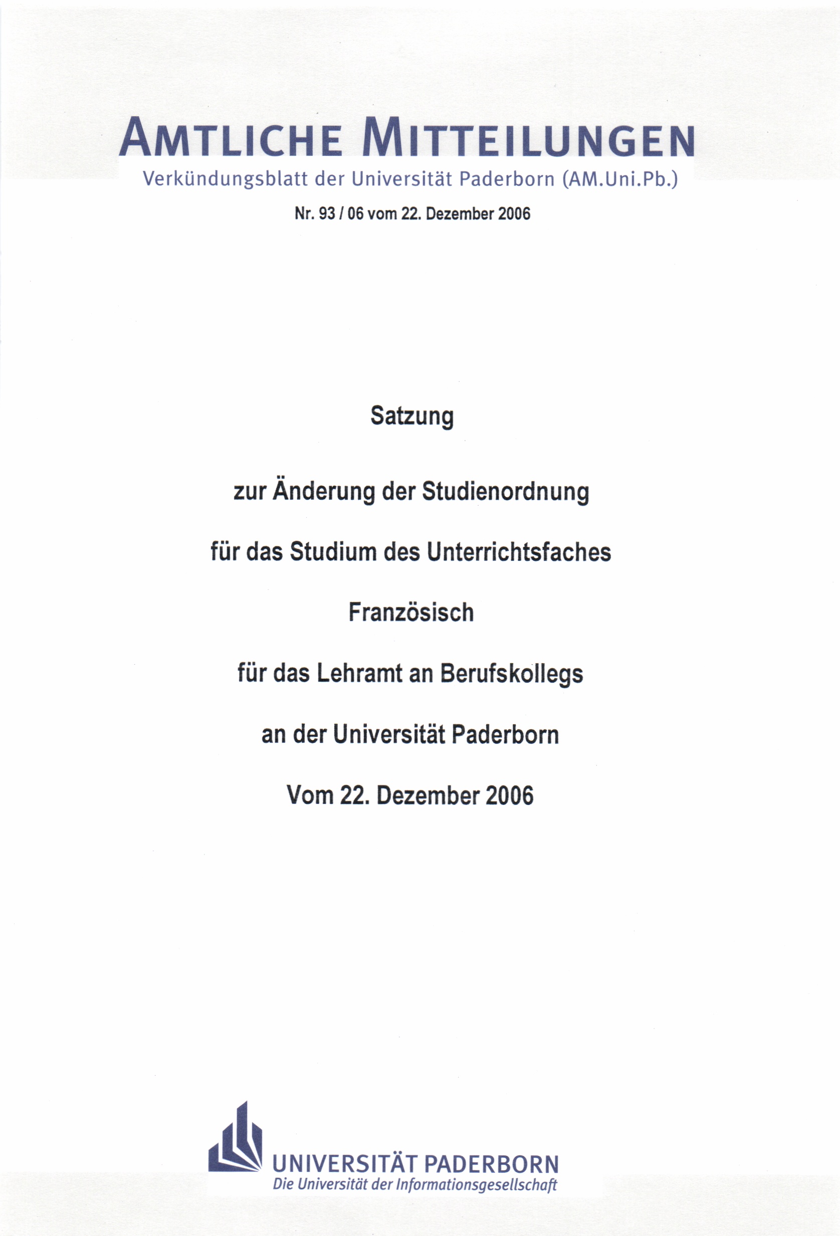 Satzung zur Änderung der Studienordnung für das Studium des Unterrichtsfaches Französisch für das Lehramt an Berufskollegs an der Universität Paderborn : vom 22. Dezember 2006