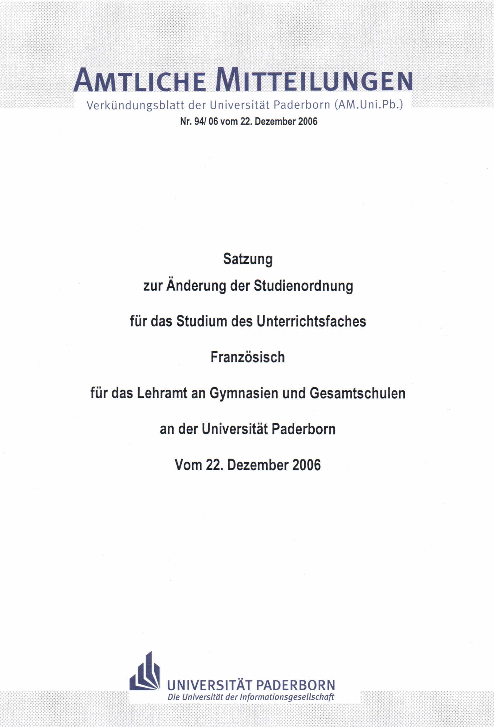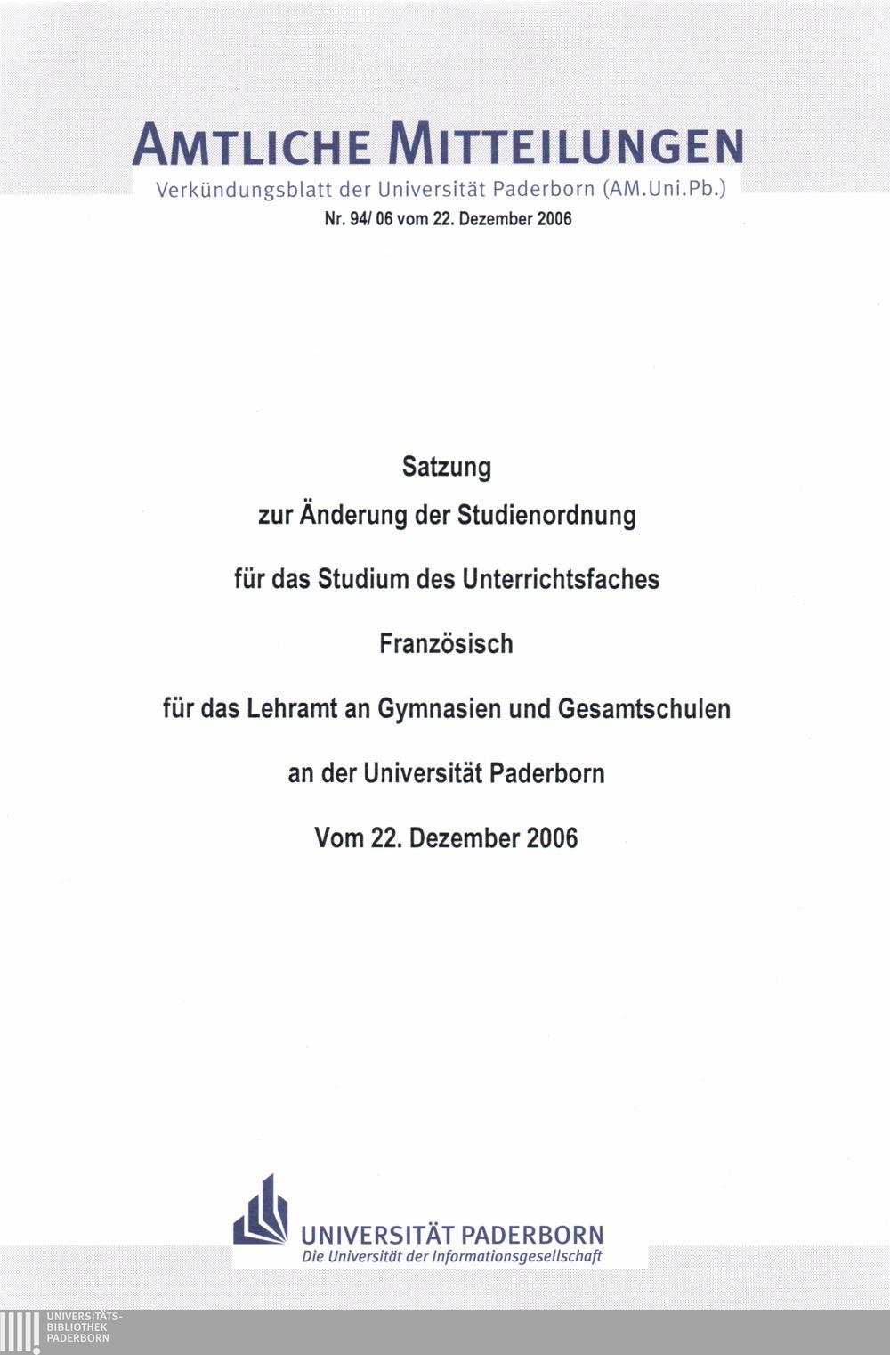 Satzung zur Änderung der Studienordnung für das Studium des Unterrichtsfaches Französisch für das Lehramt an Gymnasien und Gesamtschulen an der Universität Paderborn : vom 22. Dezember 2006