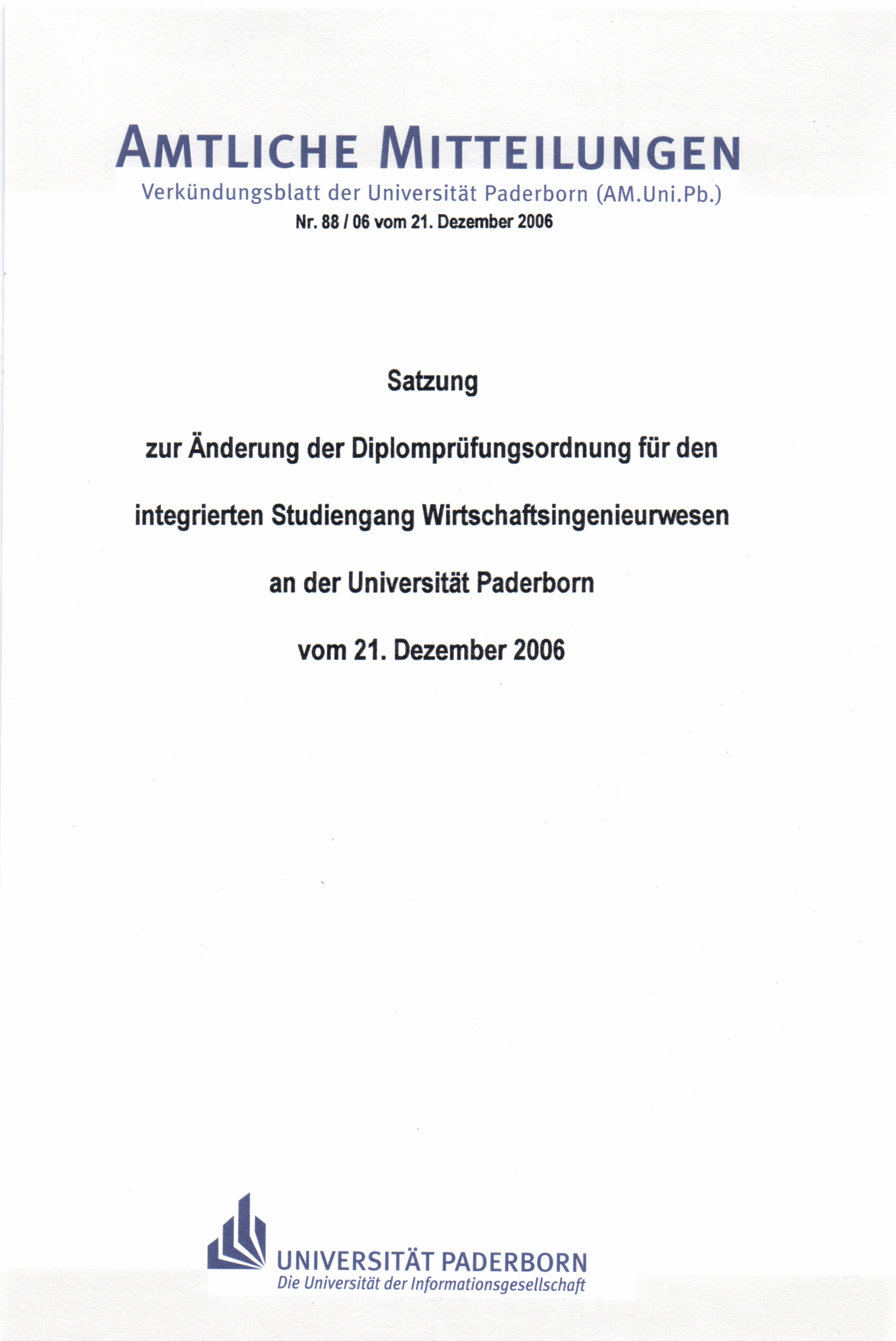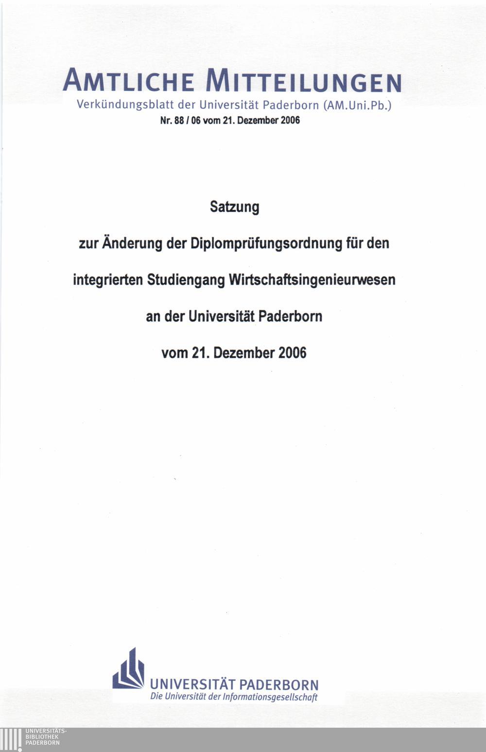 Satzung zur Änderung der Diplomprüfungsordnung für den integrierten Studiengang Wirtschaftsingenieurwesen an der Universität Paderborn : vom 21. Dezember 2006