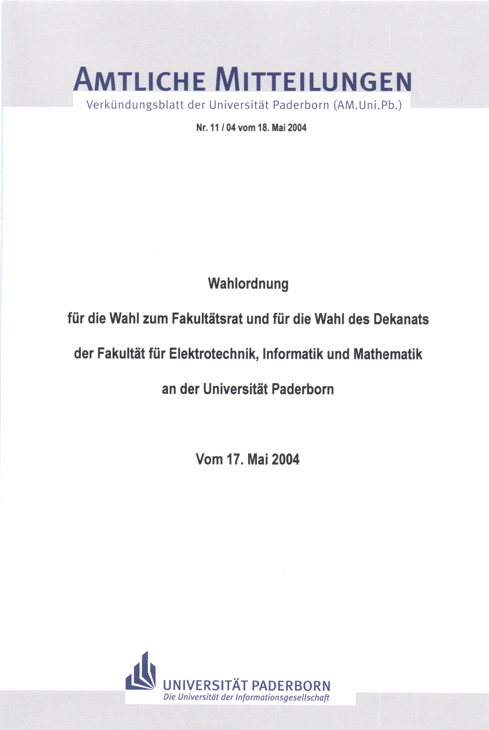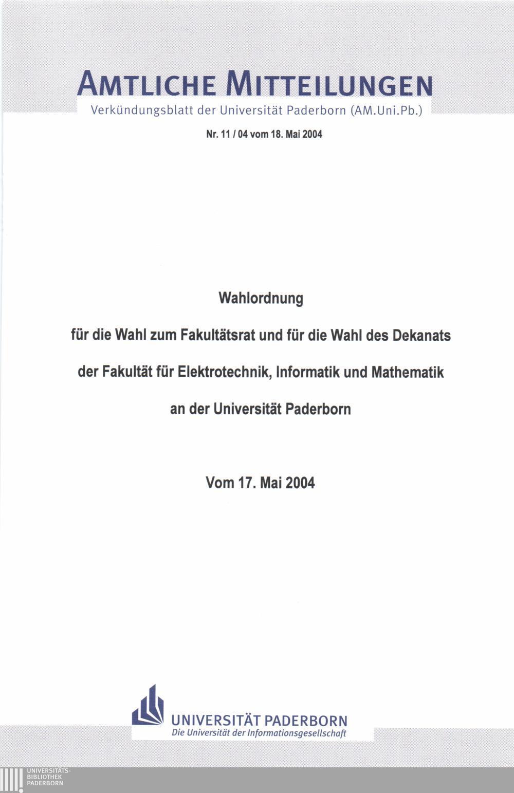 Wahlordnung für die Wahl zum Fakultätsrat und für die Wahl des Dekanats der Fakultät für Elektrotechnik, Informatik und Mathematik an der Universität Paderborn : vom 17. Mai 2004