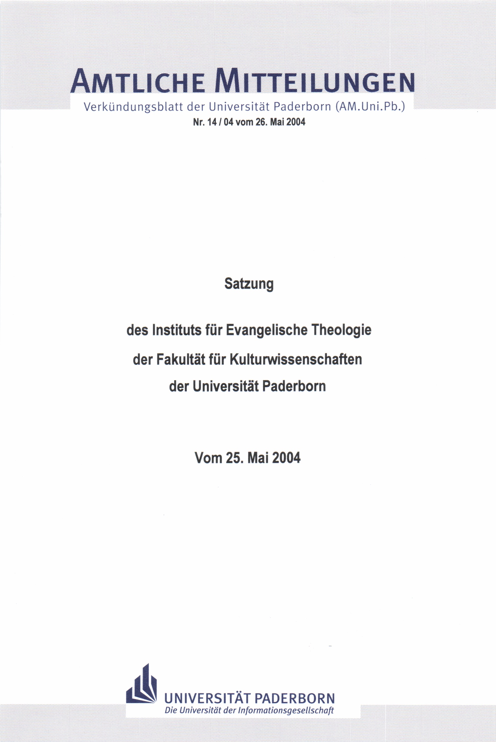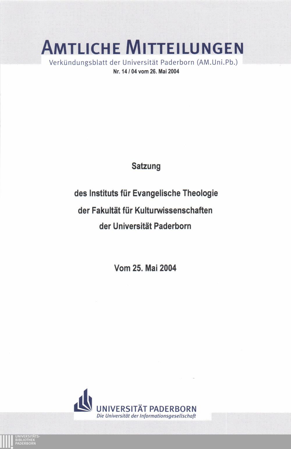 Satzung des Instituts für Evangelische Theologie der Fakultät für Kulturwissenschaften der Universität Paderborn : vom 25. Mai 2004