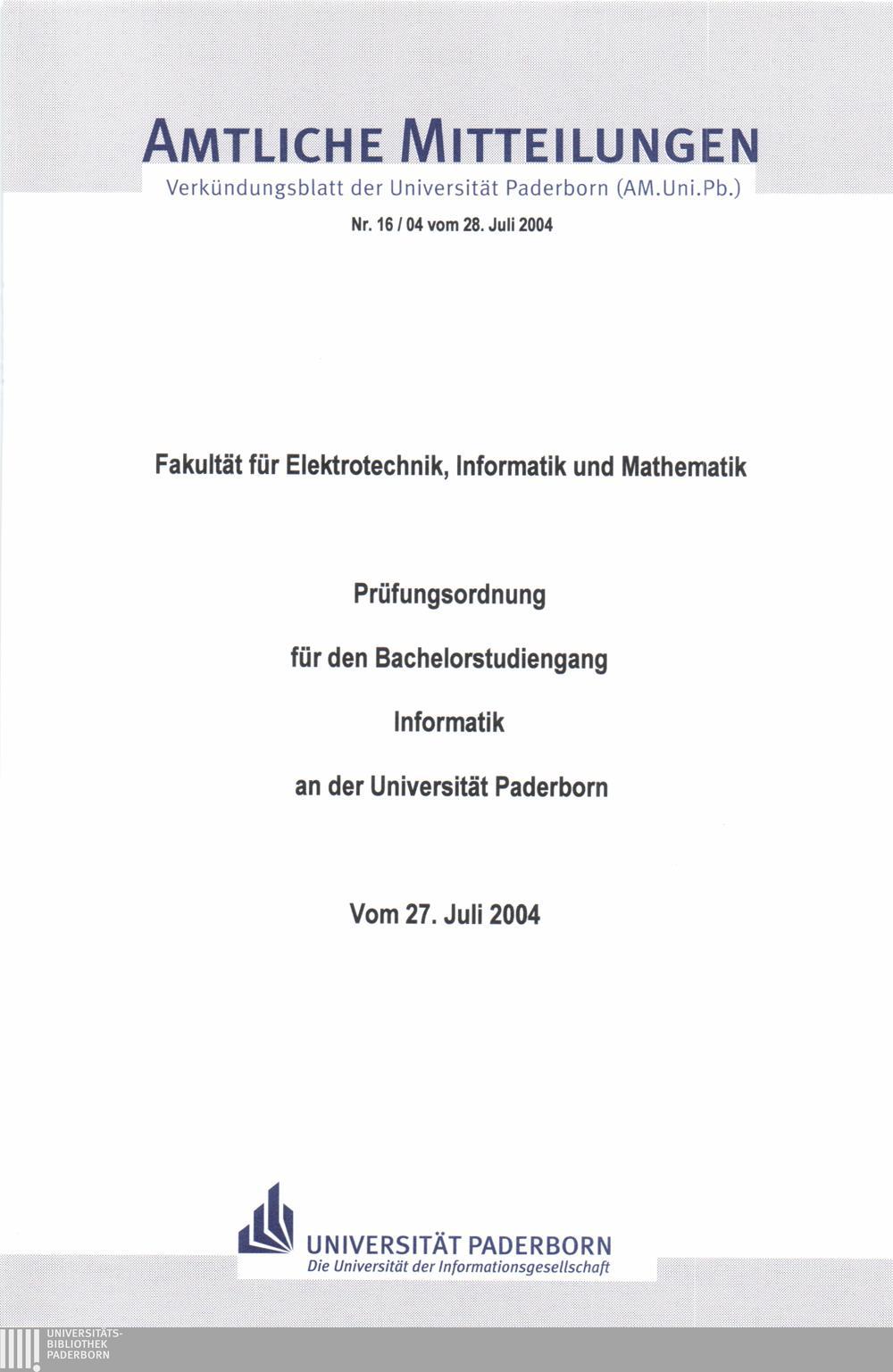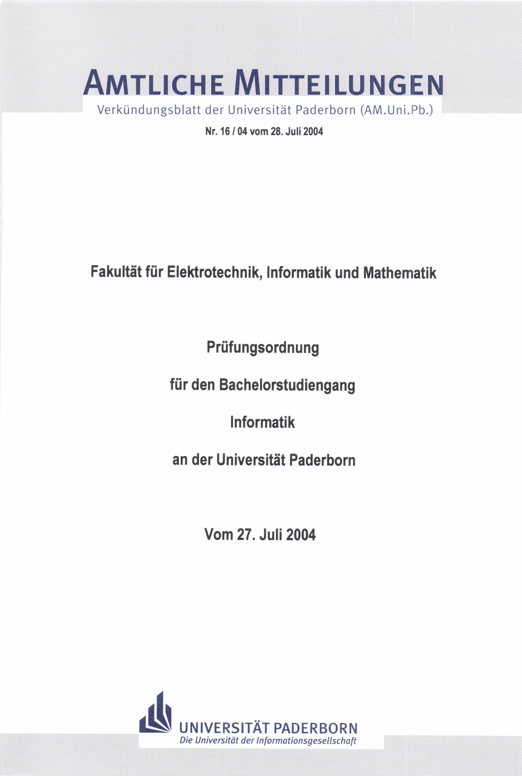 Prüfungsordnung für den Bachelorstudiengang Informatik an der Universität Paderborn : vom 27. Juli 2004 / Fakultät für Elektrotechnik, Informatik und Mathematik