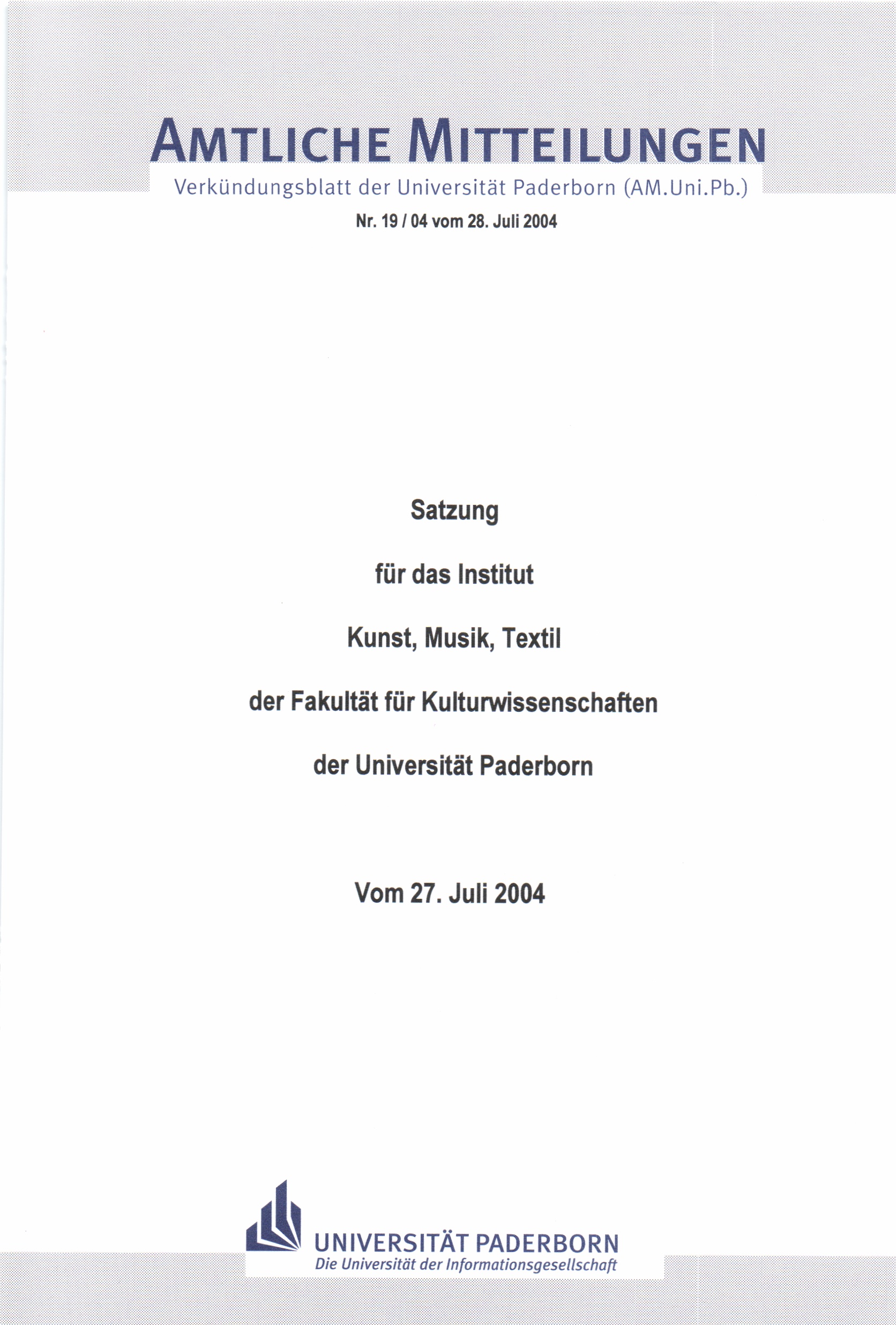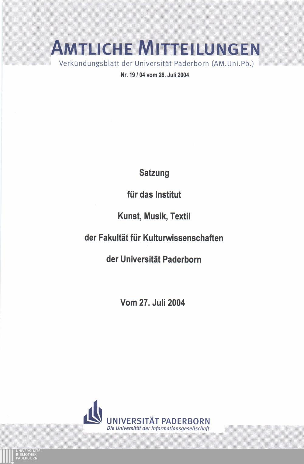 Satzung für das Institut Kunst, Musik, Textil der Fakultät für Kulturwissenschaften der Universität Paderborn : vom 27. Juli 2004