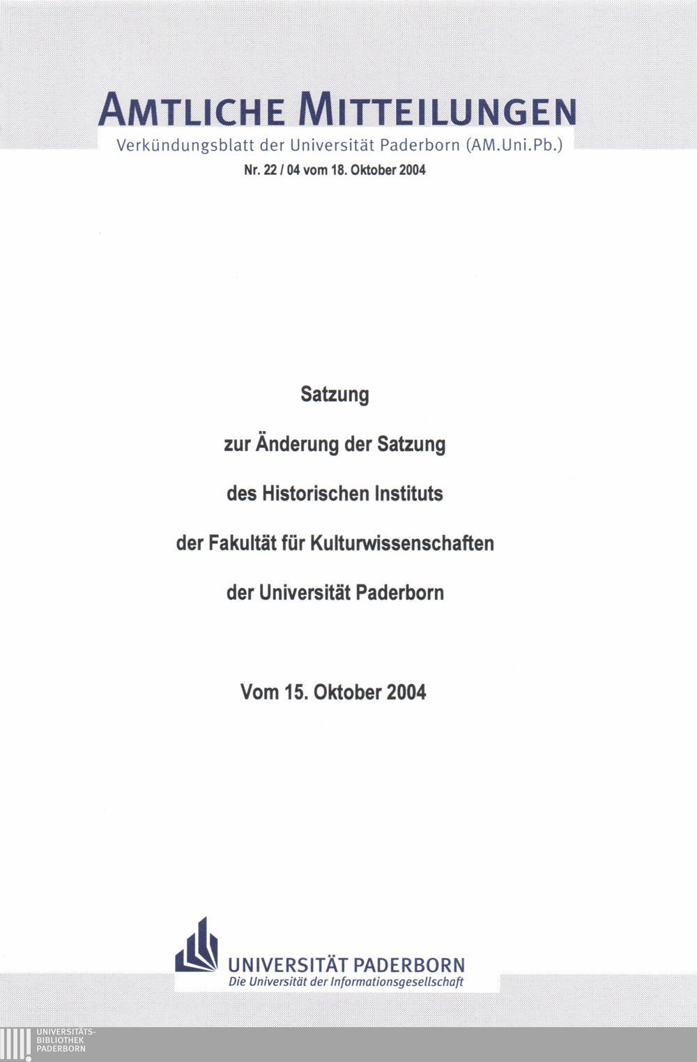Satzung zur Änderung der Satzung des Historischen Instituts der Fakultät für Kulturwissenschaften der Universität Paderborn : vom 15. Oktober 2004