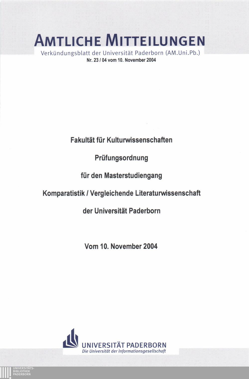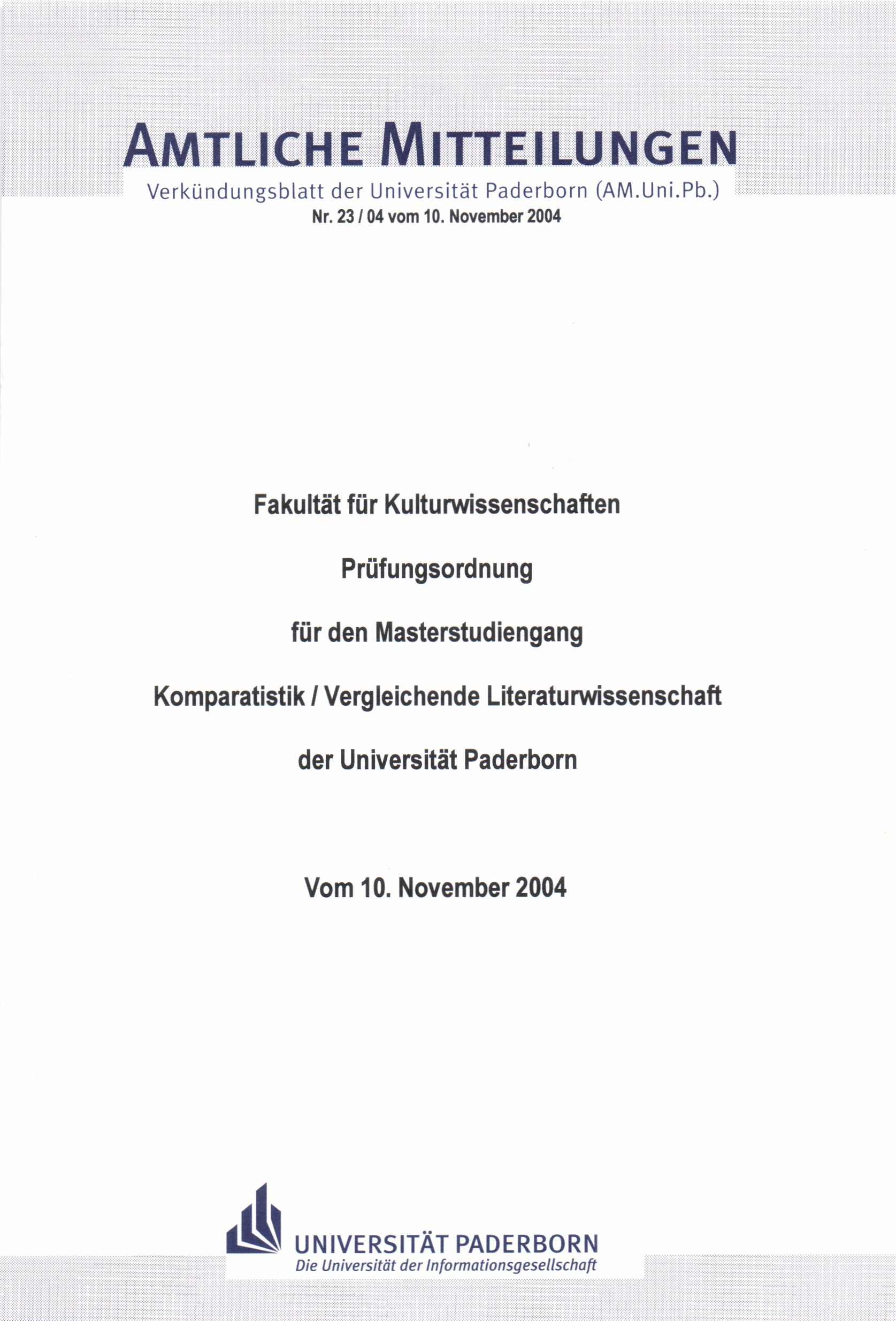 Prüfungsordnung für den Masterstudiengang Komparatistik, Vergleichende Literaturwissenschaft der Universität Paderborn : vom 10. November 2004 / Fakultät für Naturwissenschaften