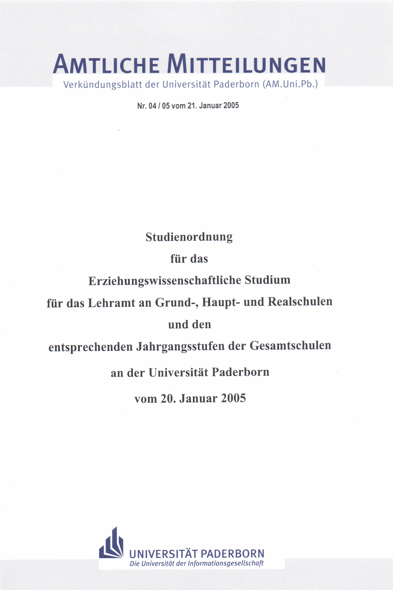 Studienordnung für das Erziehungswissenschaftliche Studium für das Lehramt an Grund-, Haupt- und Realschulen und den entsprechenden Jahrgangsstufen der Gesamtschulen an der Universität Paderborn : vom 20. Januar 2005