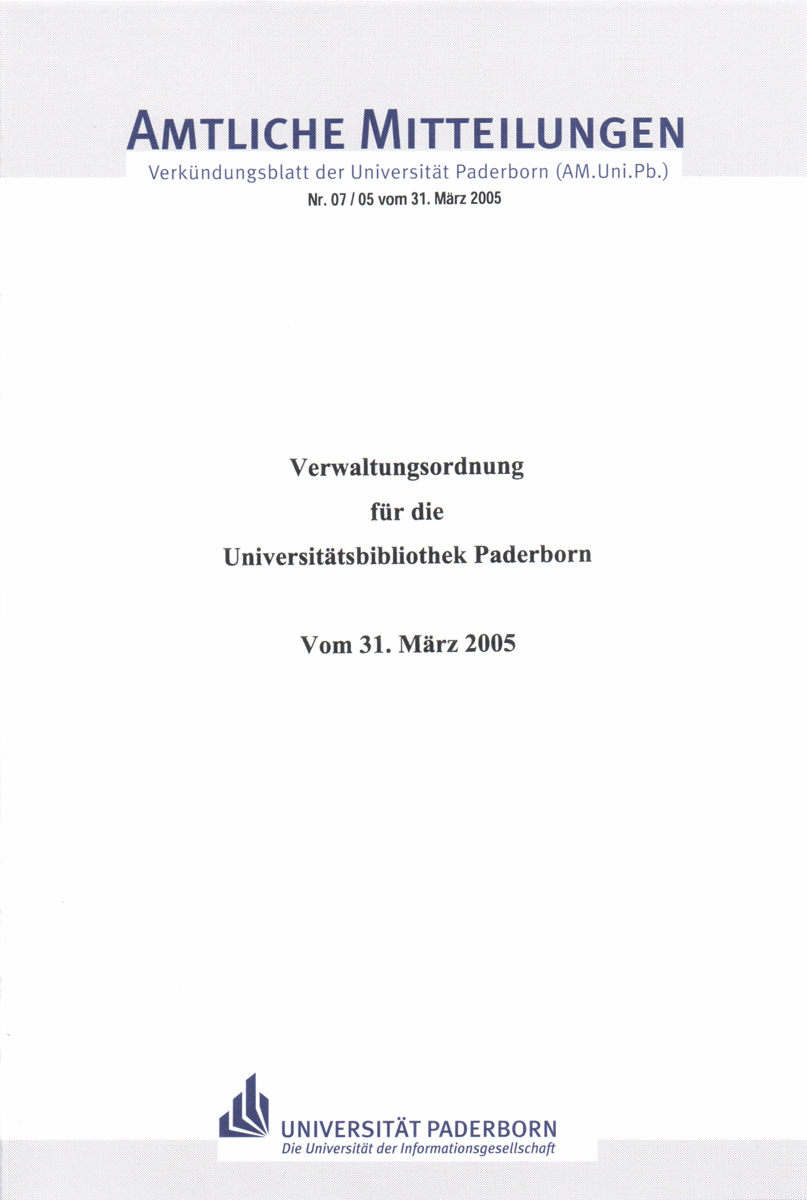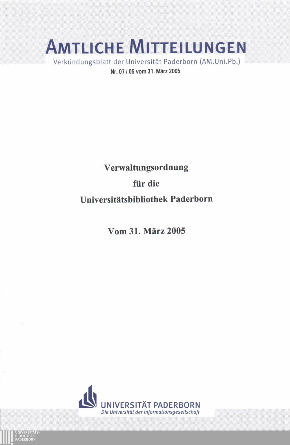 Verwaltungsordnung für die Universitätsbibliothek Paderborn : vom 31. März 2005
