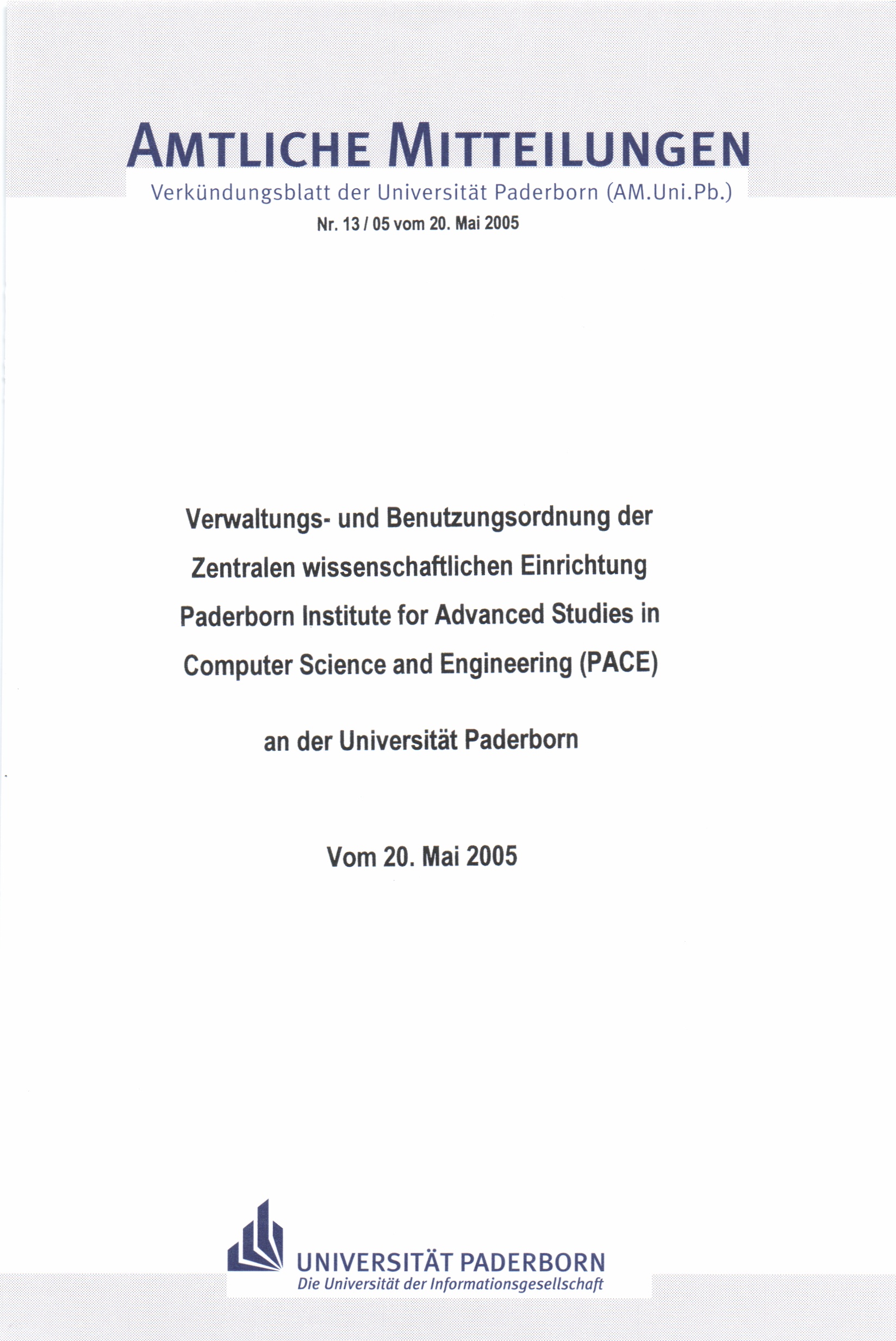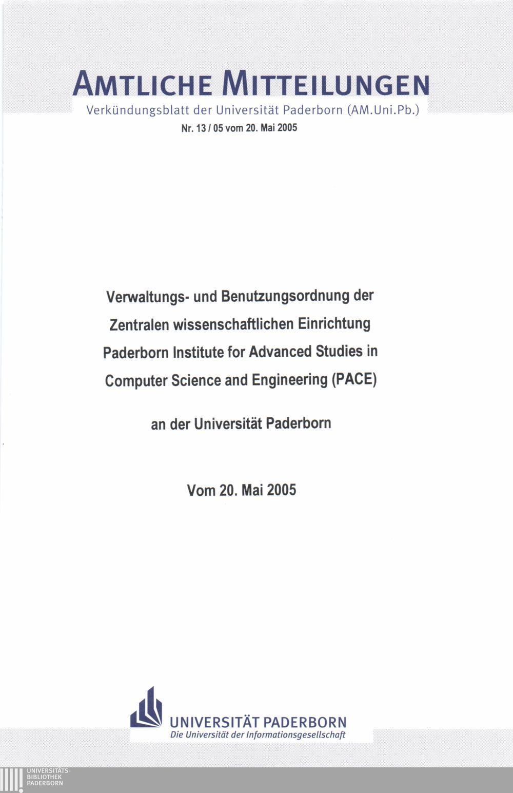 Verwaltungs- und Benutzungsordnung der Zentralen Wissenschaftlichen Einrichtung "Paderborn Institute for Advanced Studies in Computer Science and Engineering (PACE)" an der Universität Paderborn : vom 20. Mai 2005