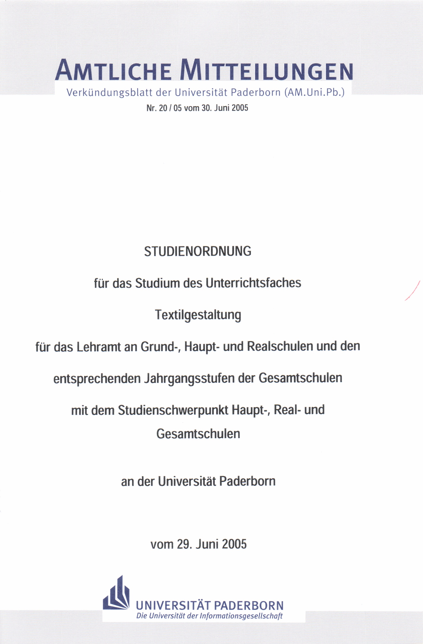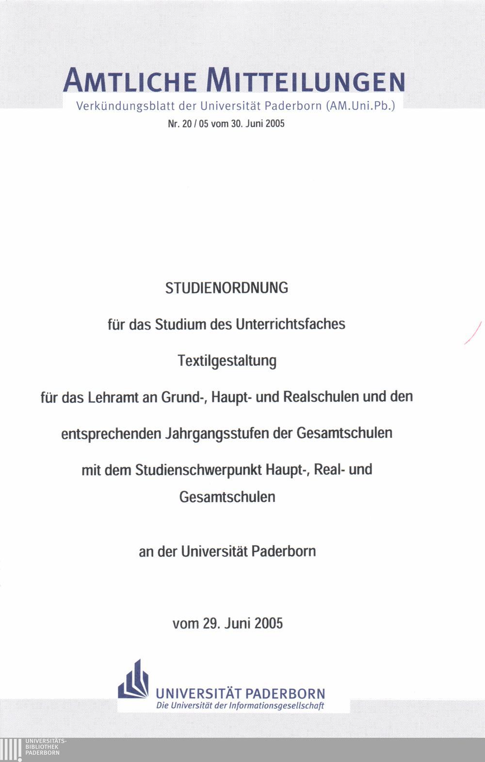 Studienordnung für das Studium des Unterrichtsfaches Textilgestaltung für das Lehramt an Grund-, Haupt- und Realschulen und den entsprechenden Jahrgangsstufen der Gesamtschulen mit dem Studienschwerpunkt Haupt-, Real- und Gesamtschulen an der Universität Paderborn : vom 29. Juni 2005