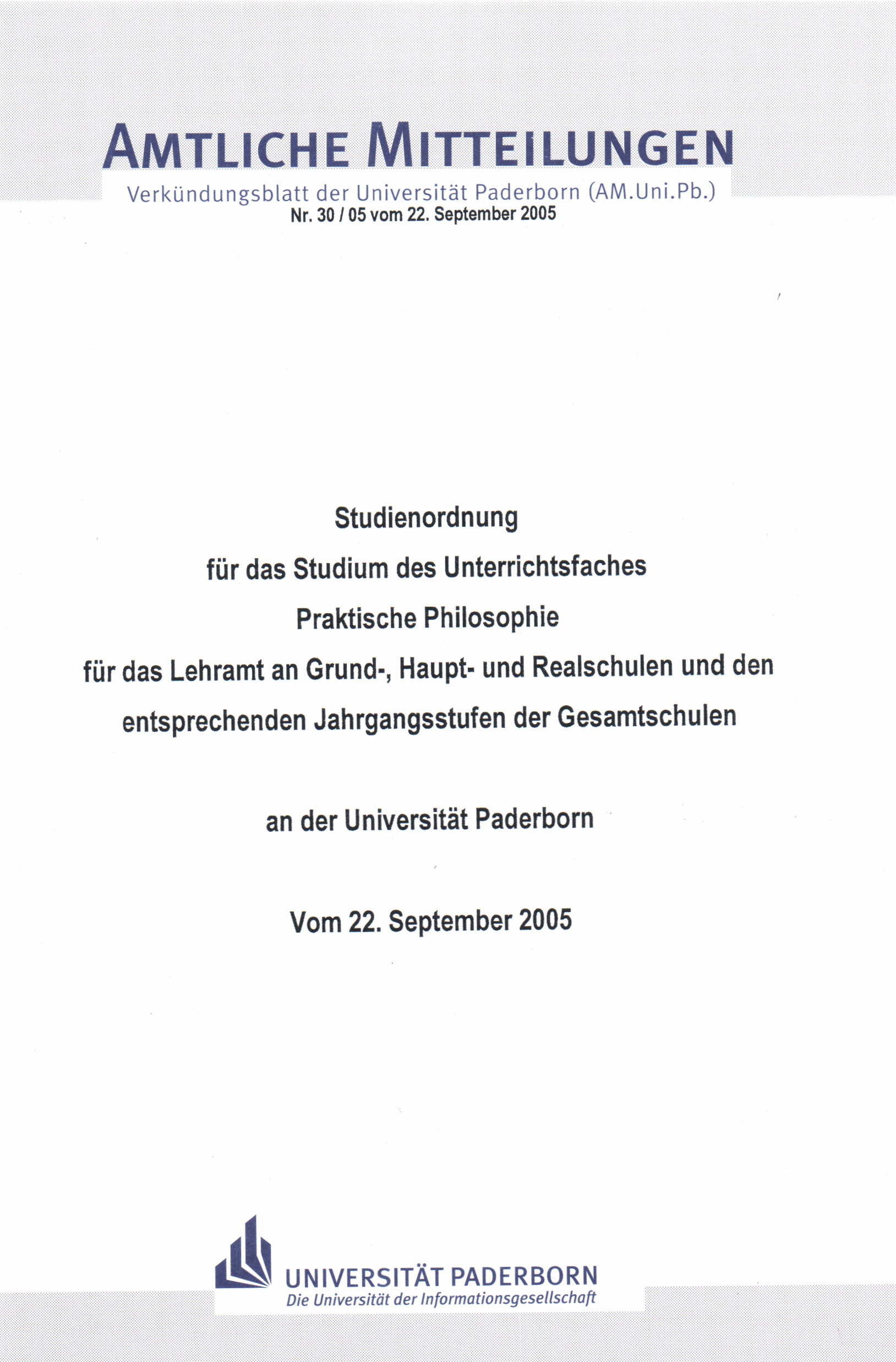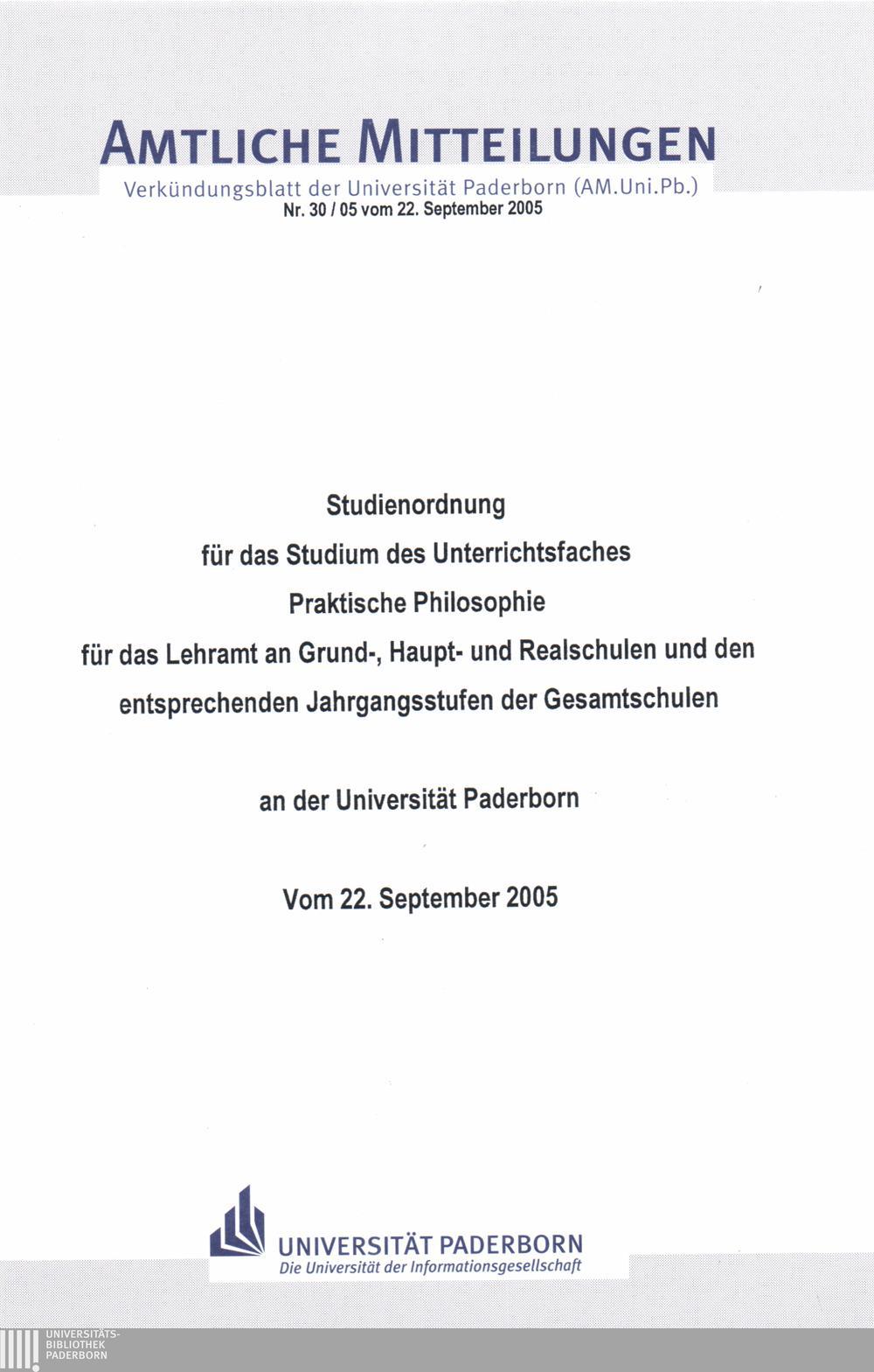 Studienordnung für das Studium des Unterrichtsfaches Praktische Philosophie für das Lehramt an Grund-, Haupt- und Realschulen und den entsprechenden Jahrgangsstufen der Gesamtschulen an der Universität Paderborn : vom 22. September 2005