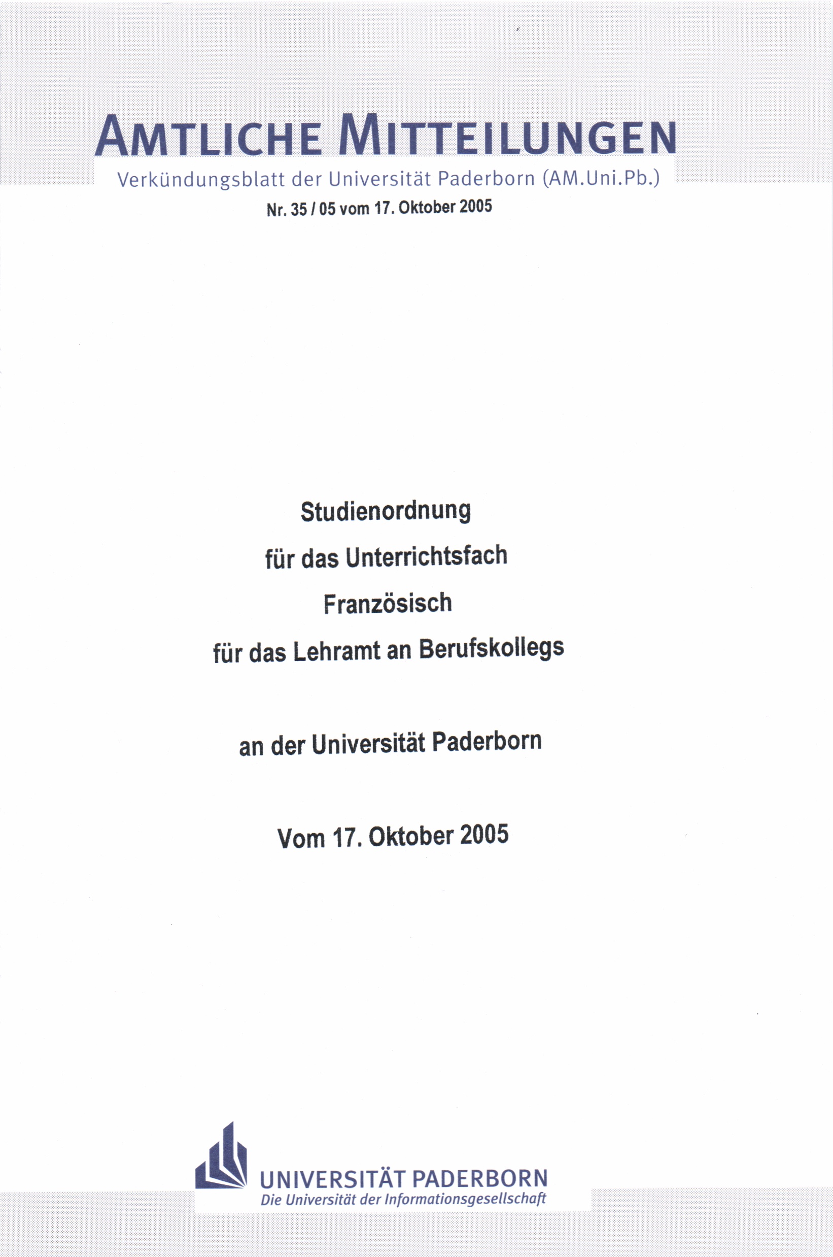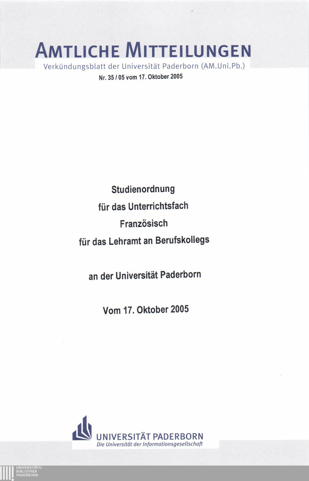 Studienordnung für das Unterrichtsfach Französisch für das Lehramt an Berufskollegs an der Universität Paderborn : vom 17. Oktober 2005