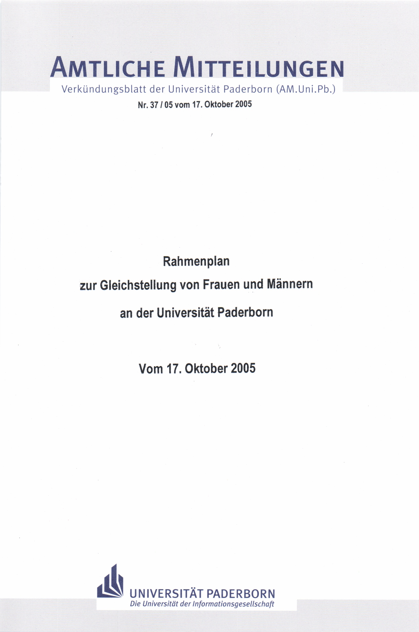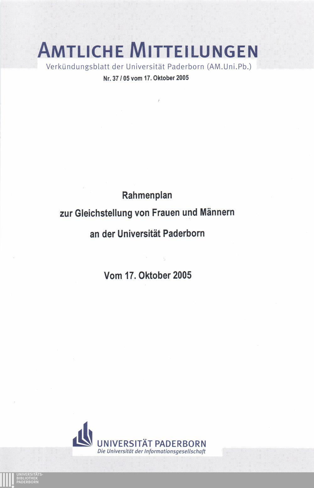 Rahmenplan zur Gleichstellung von Frauen und Männern an der Universität Paderborn : vom 17. Oktober 2005