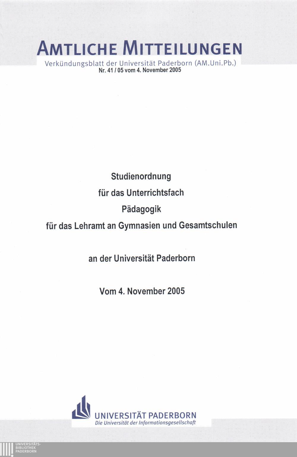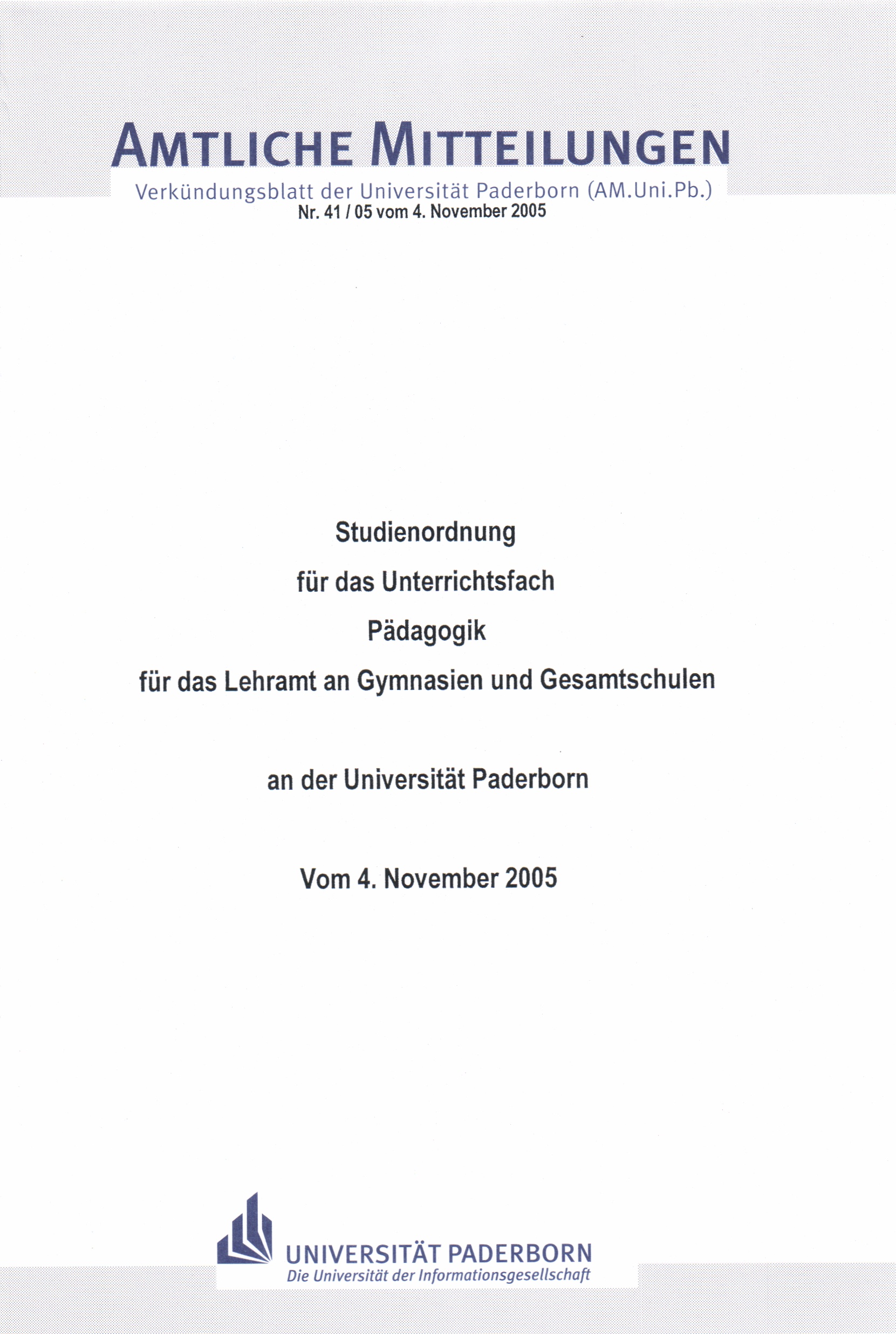 Studienordnung für das Unterrichtsfach Pädagogik für das Lehramt an Gymnasien und Gesamtschulen an der Universität Paderborn : vom 4. November 2005