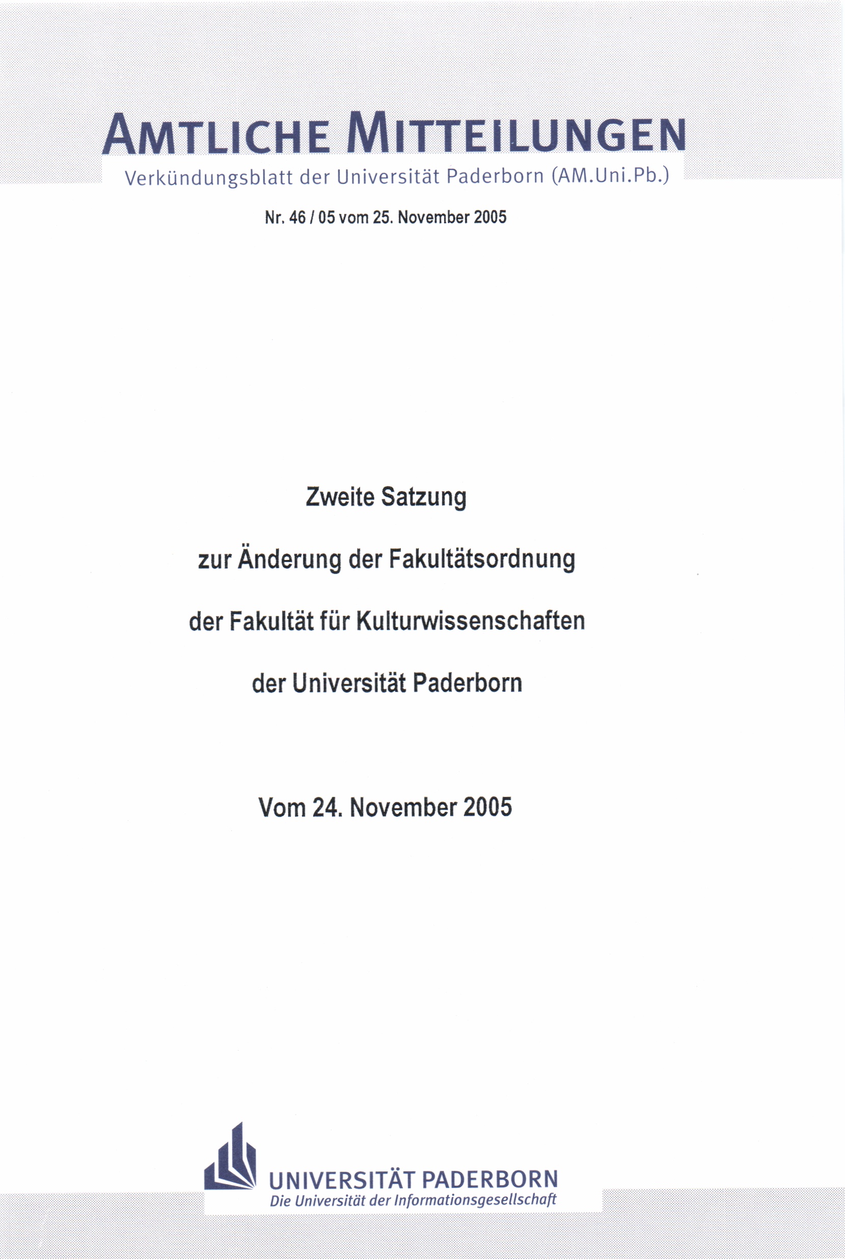 Zweite Satzung zur Änderung der Fakultätsordnung der Fakultät für Kulturwissenschaften der Universität Paderborn : vom 24. November 2005