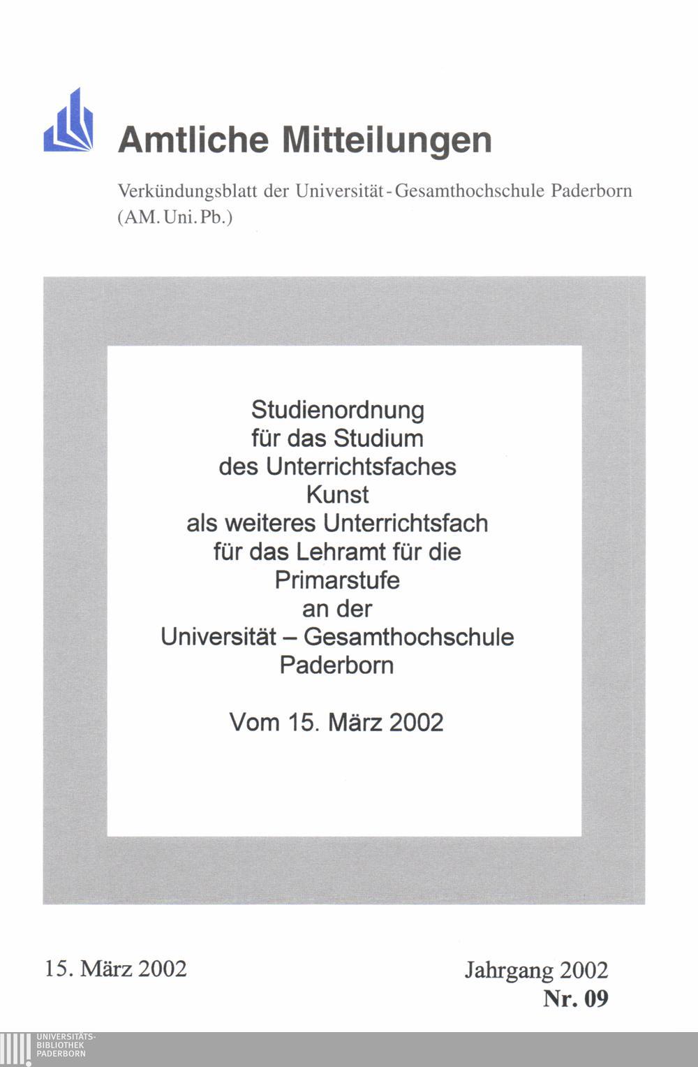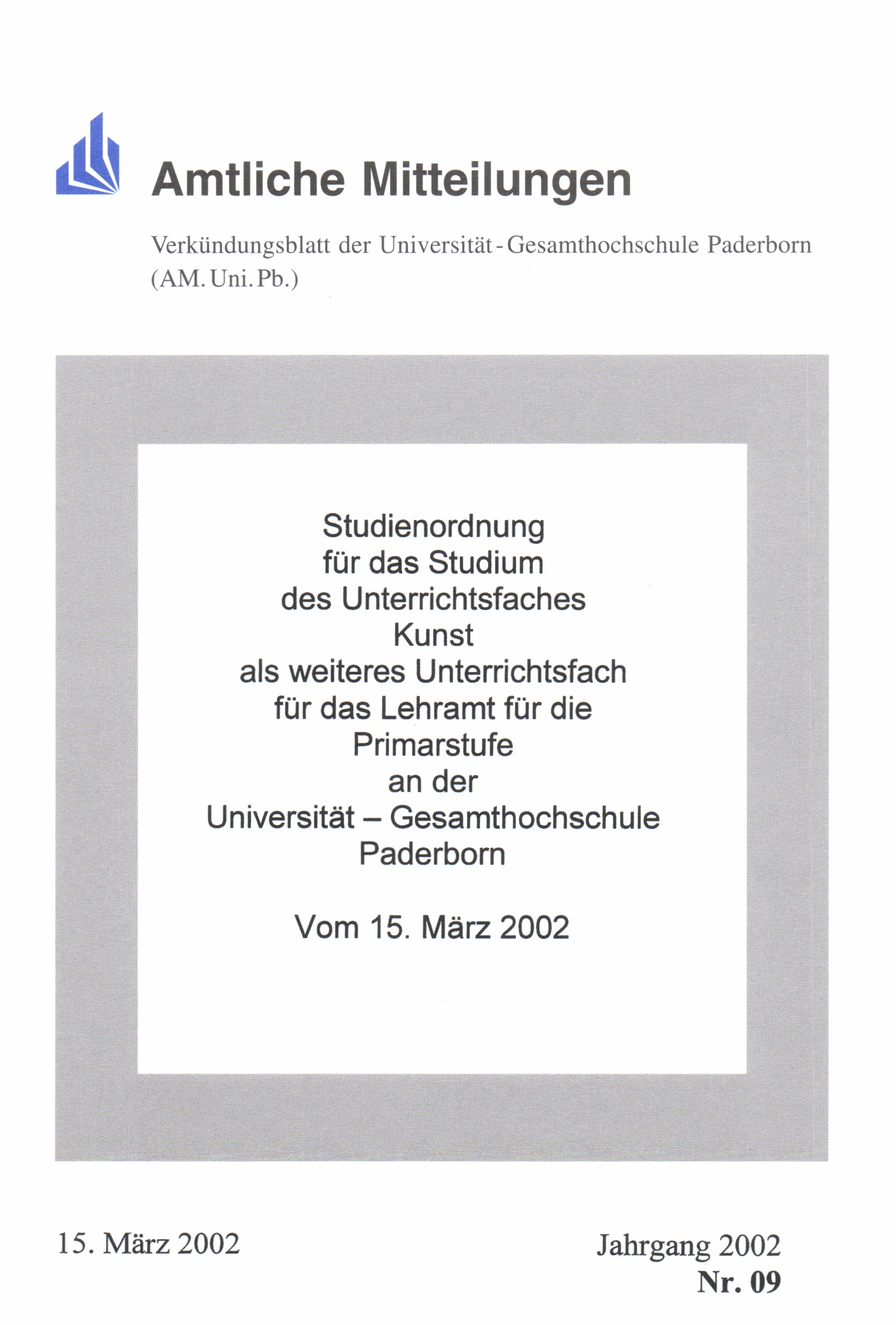 Studienordnung für das Studium des Unterrichtsfaches Kunst als weiteres Unterrichtsfach für das Lehramt für die Primarstufe an der Universität Gesamthochschule Paderborn : vom 15. März 2002