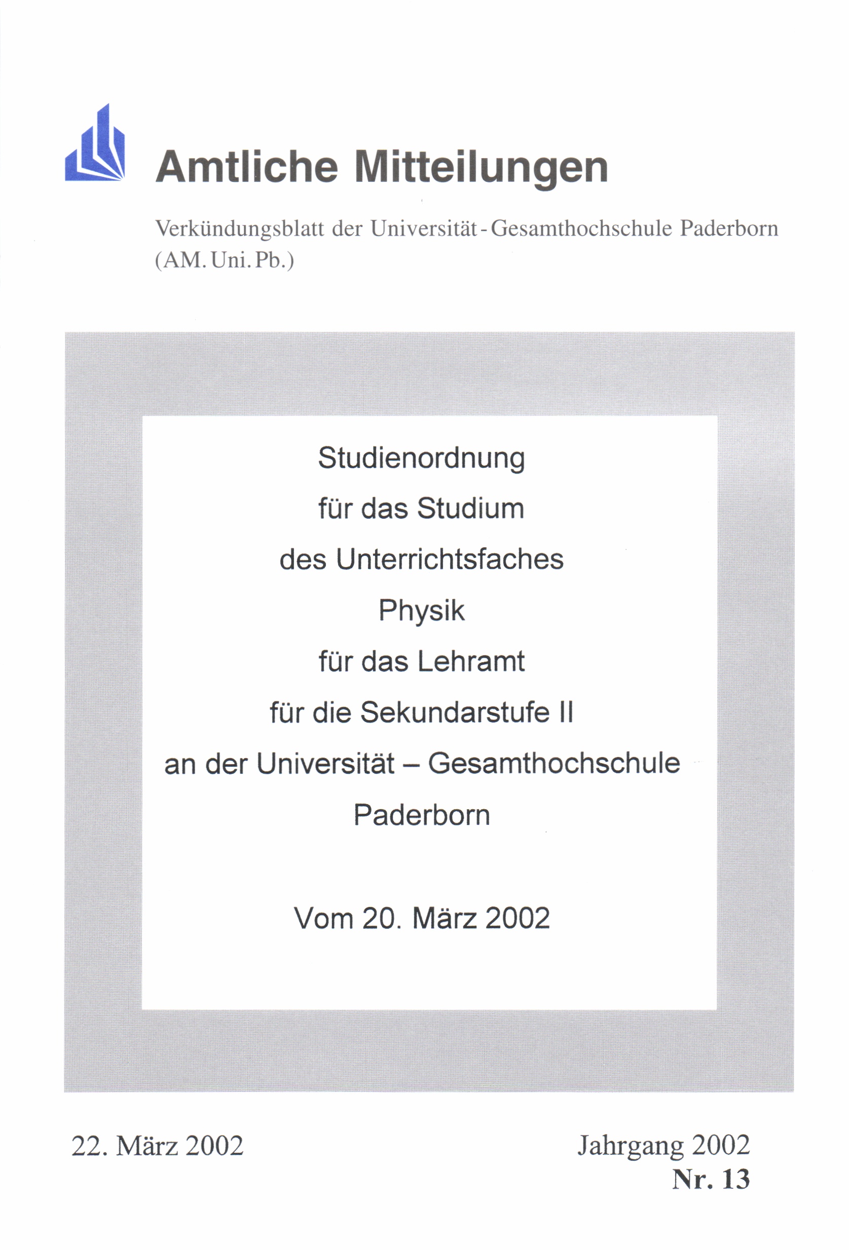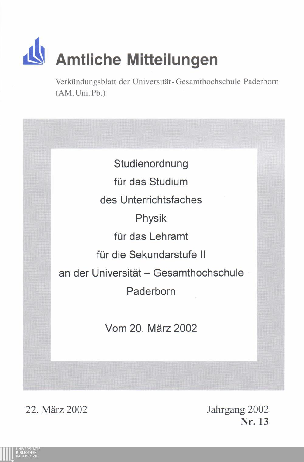 Studienordnung für das Studium des Unterrichtsfaches Physik für das Lehramt für die Sekundarstufe II an der Universität Gesamthochschule Paderborn : vom 20. März 2002