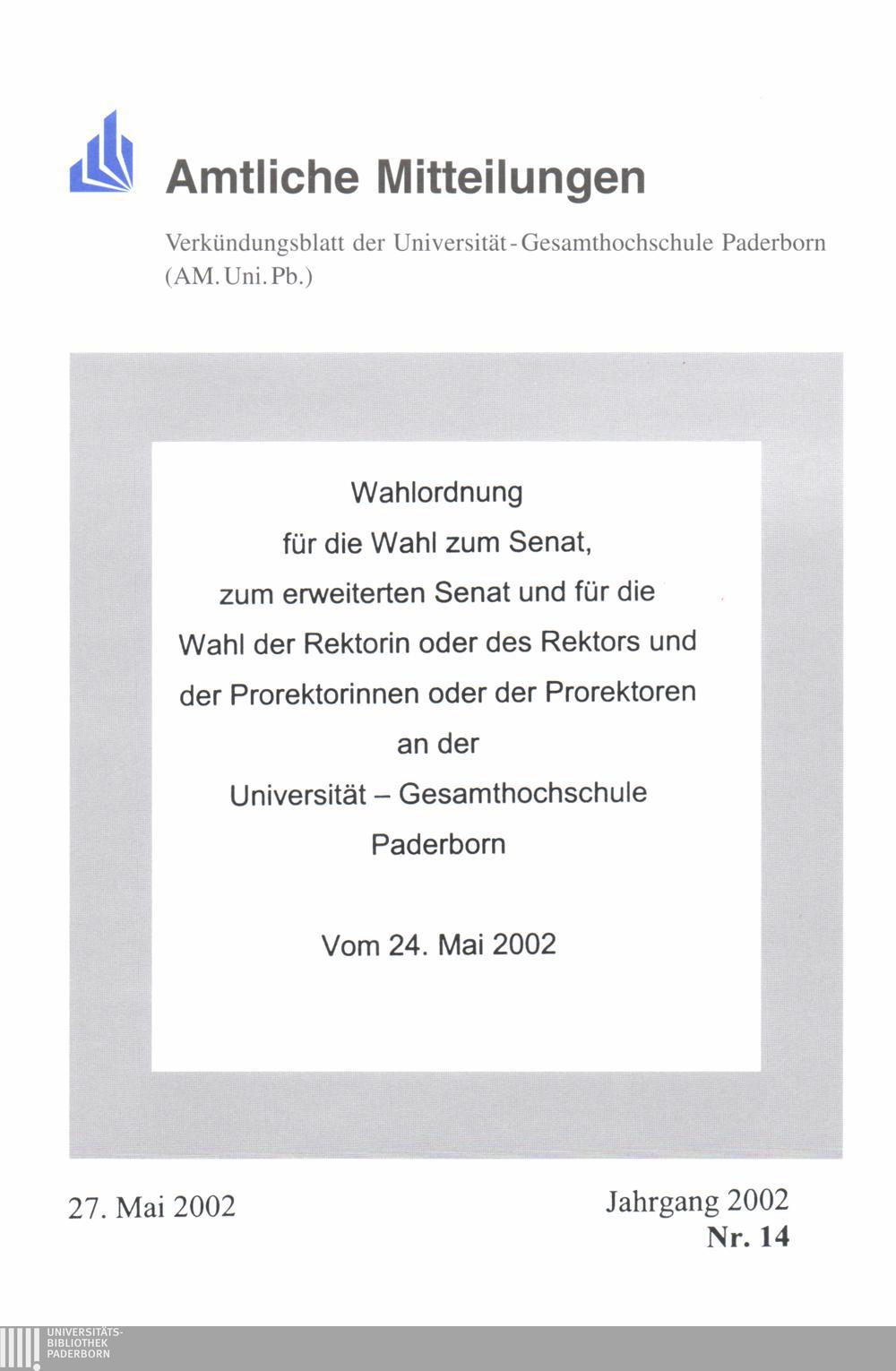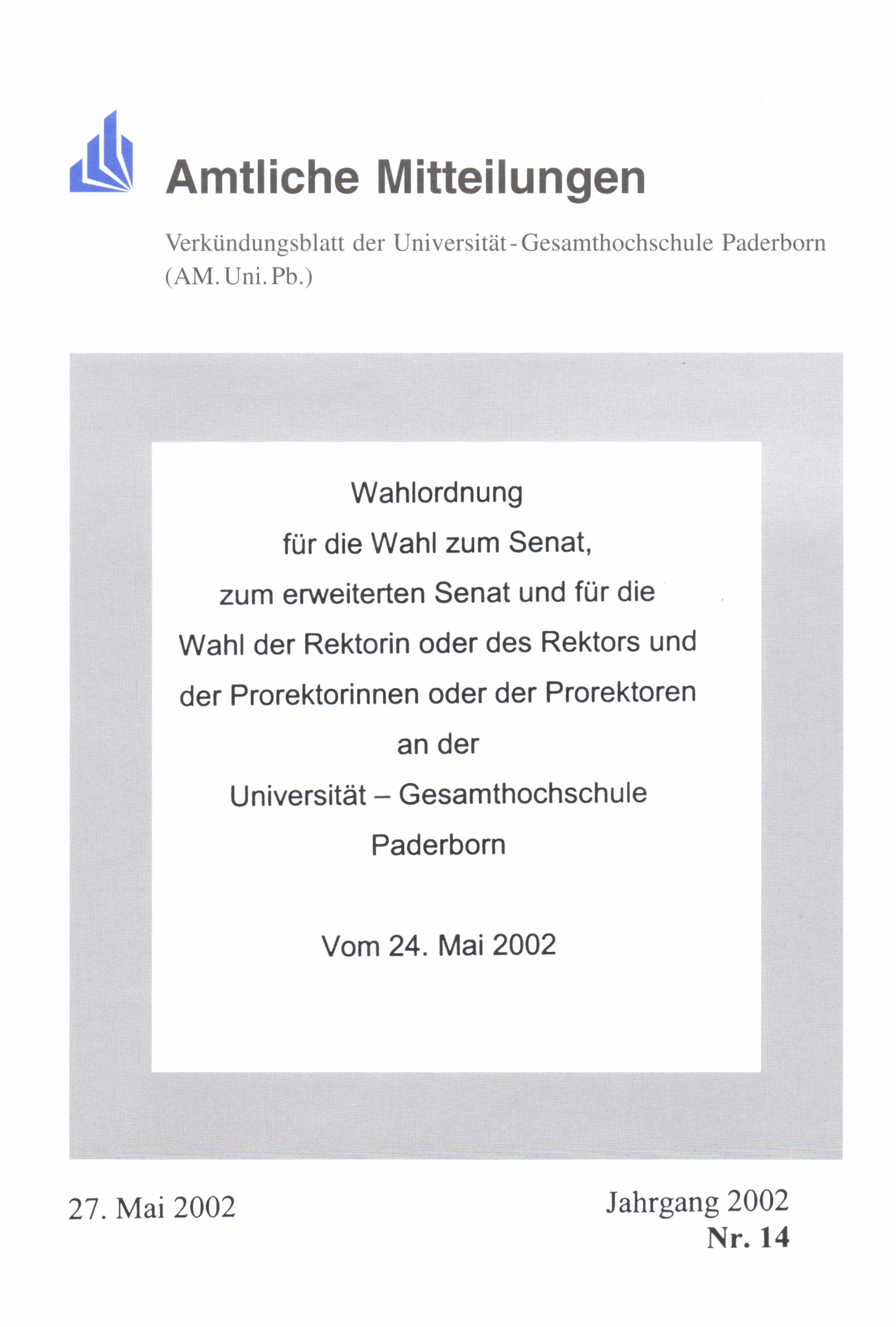Wahlordnung für die Wahl zum Senat, zum erweiterten Senat und für die Wahl der Rektorin oder des Rektors und der Prorektorinnen oder der Prorektoren an der Universität-Gesamthochschule Paderborn : vom 24. Mai 2002